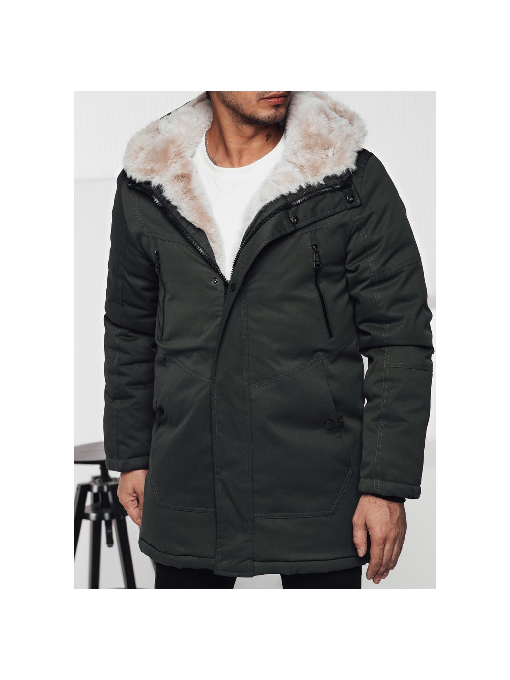 (Méret L/50) Sötétzöld férfi téli parka kapucnival és szőrmével