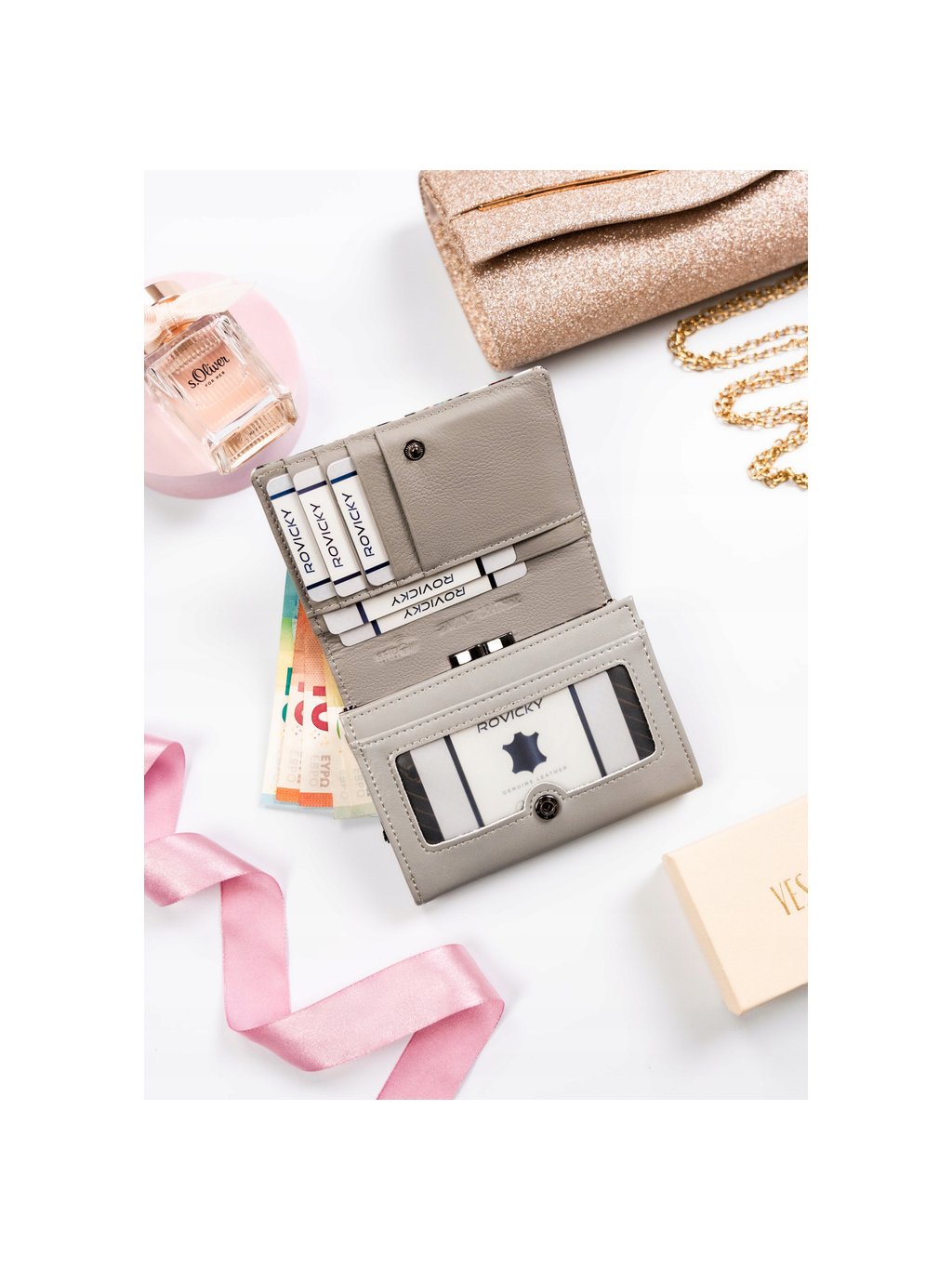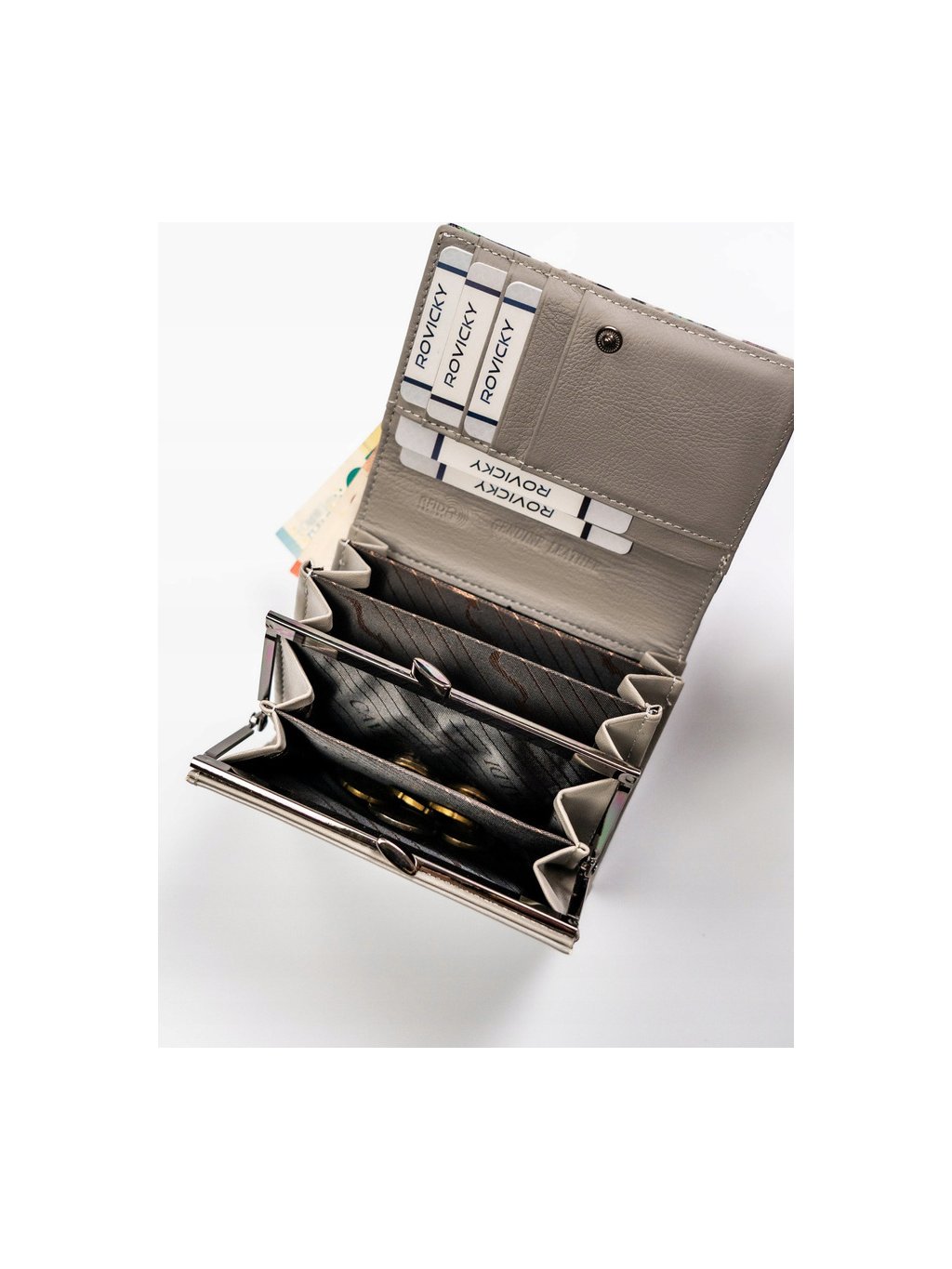 - a pénztárca szárnya gyönyörű, dombornyomott pillangós díszítéssel