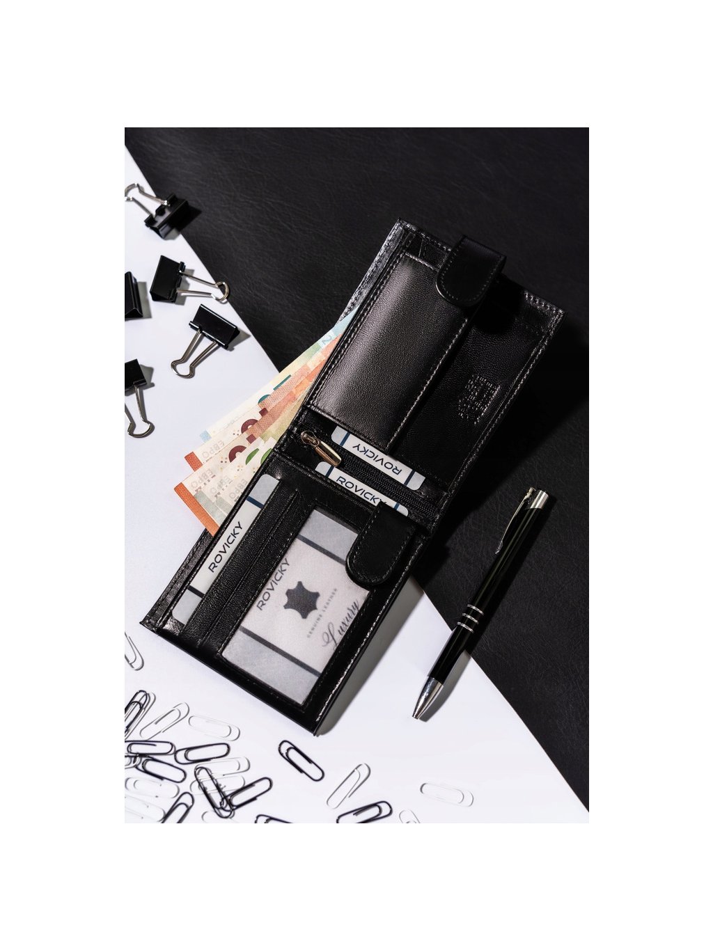 - 9 nyílás a szabványos méretű kártyák, névjegykártyák és dokumentumok számára, beleértve egy átlátszó fotórekeszt és egy külső hátsó zsebet