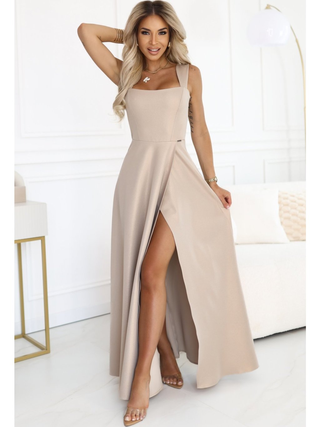 Bézs csillámos maxi ruha S hasíték
