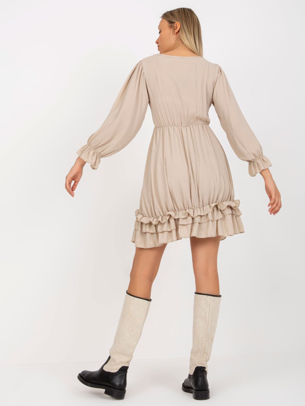 Bézs mini ruha fodros bohó stílusban