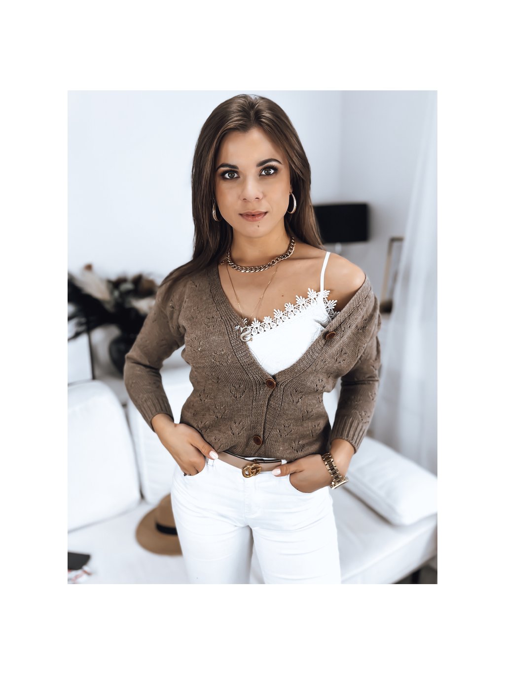 Bézs pulóver ZOLA mintákkal és gombokkal