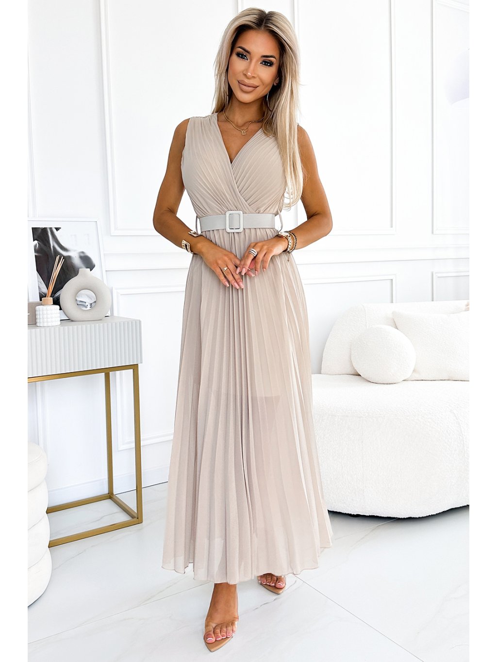 Bézs rakott midi ruha övvel