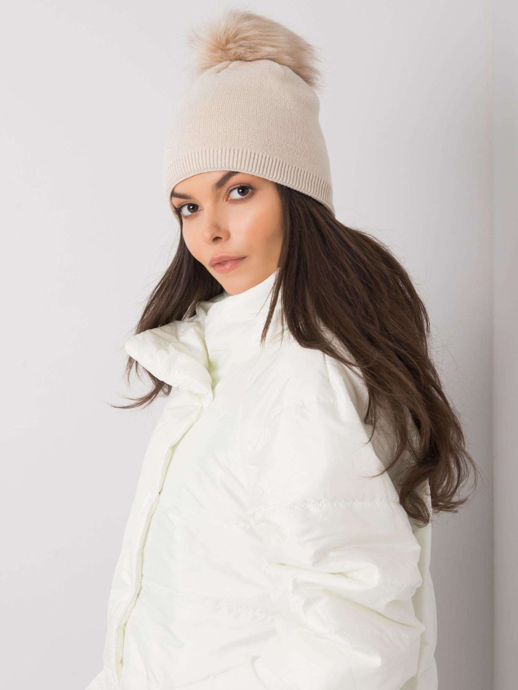 Bézs sapka szőrme pompommal
