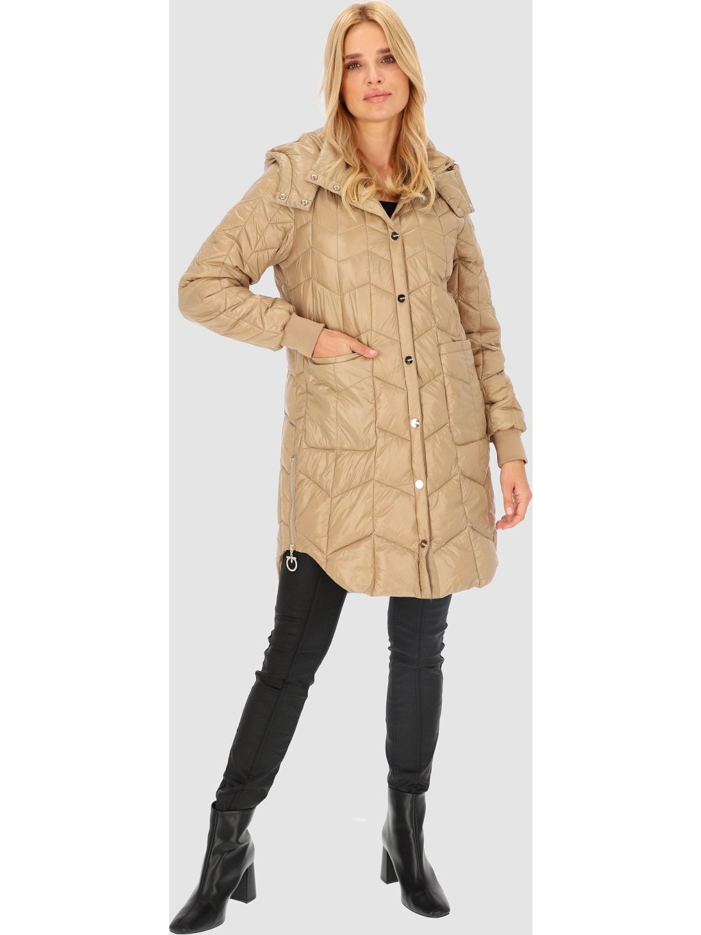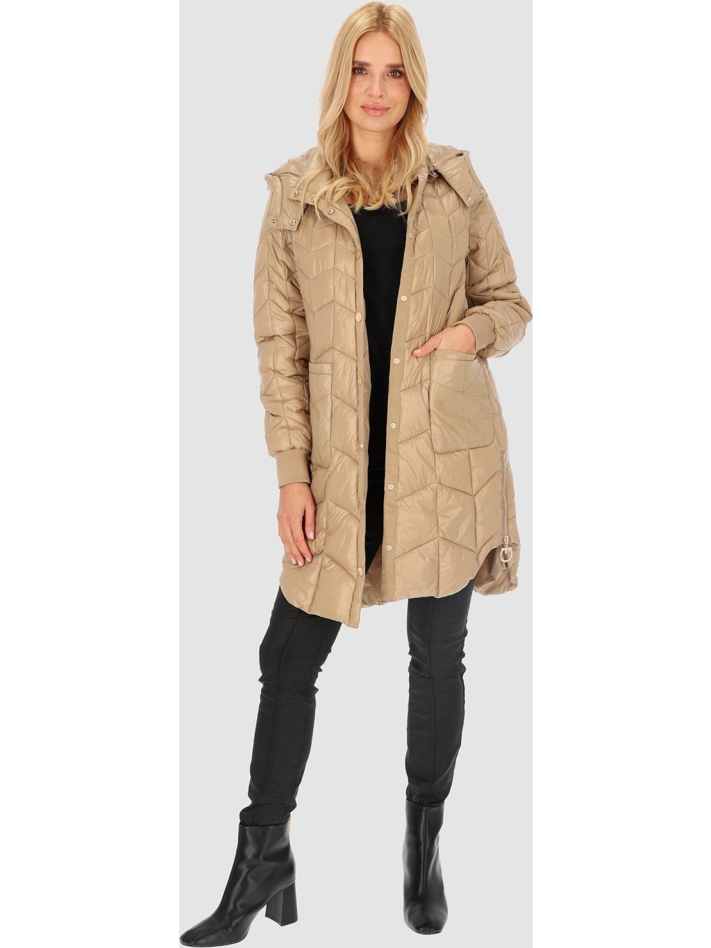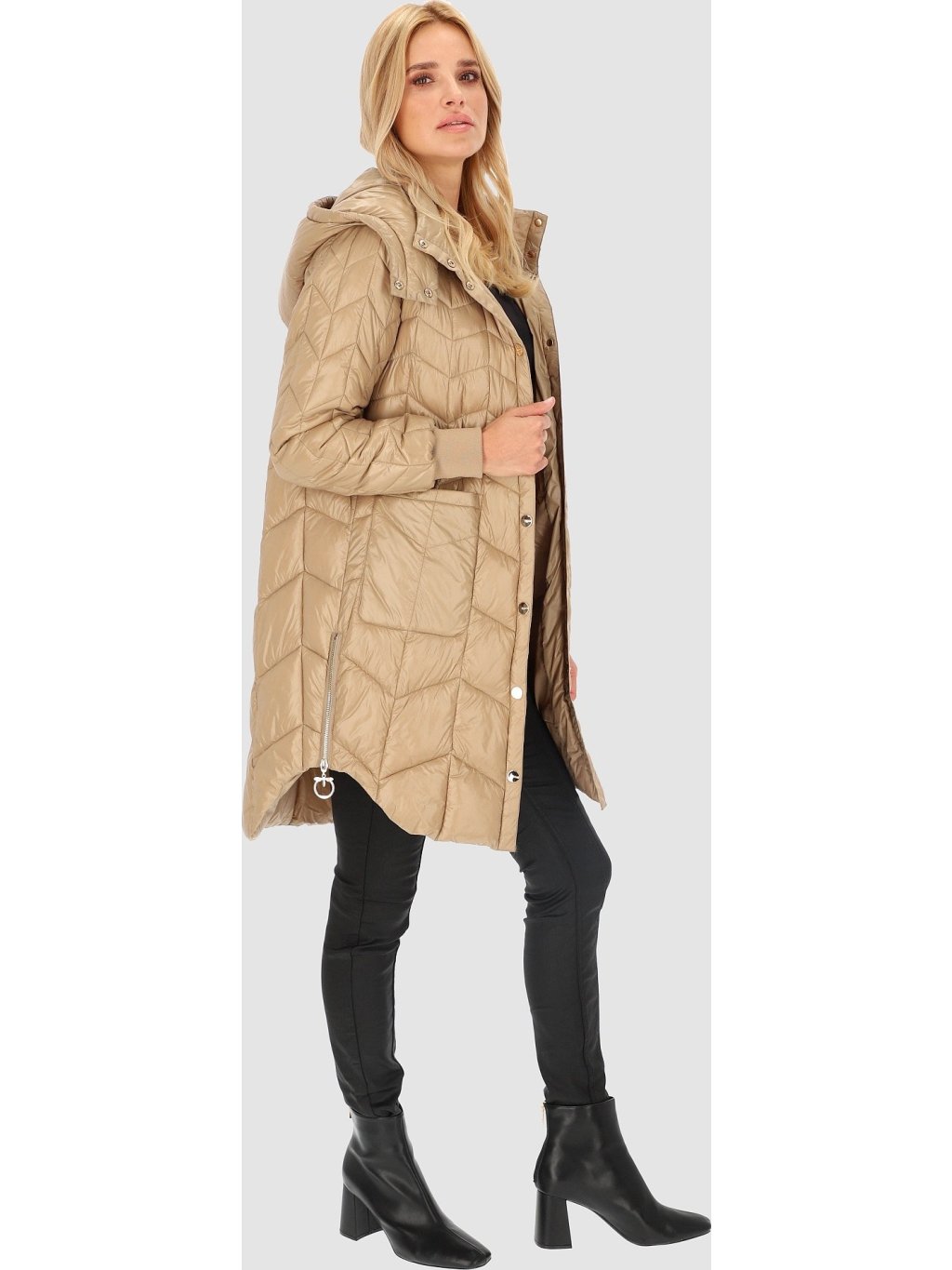 Bézs színű női steppelt kabát oldalsó hasítékokkal