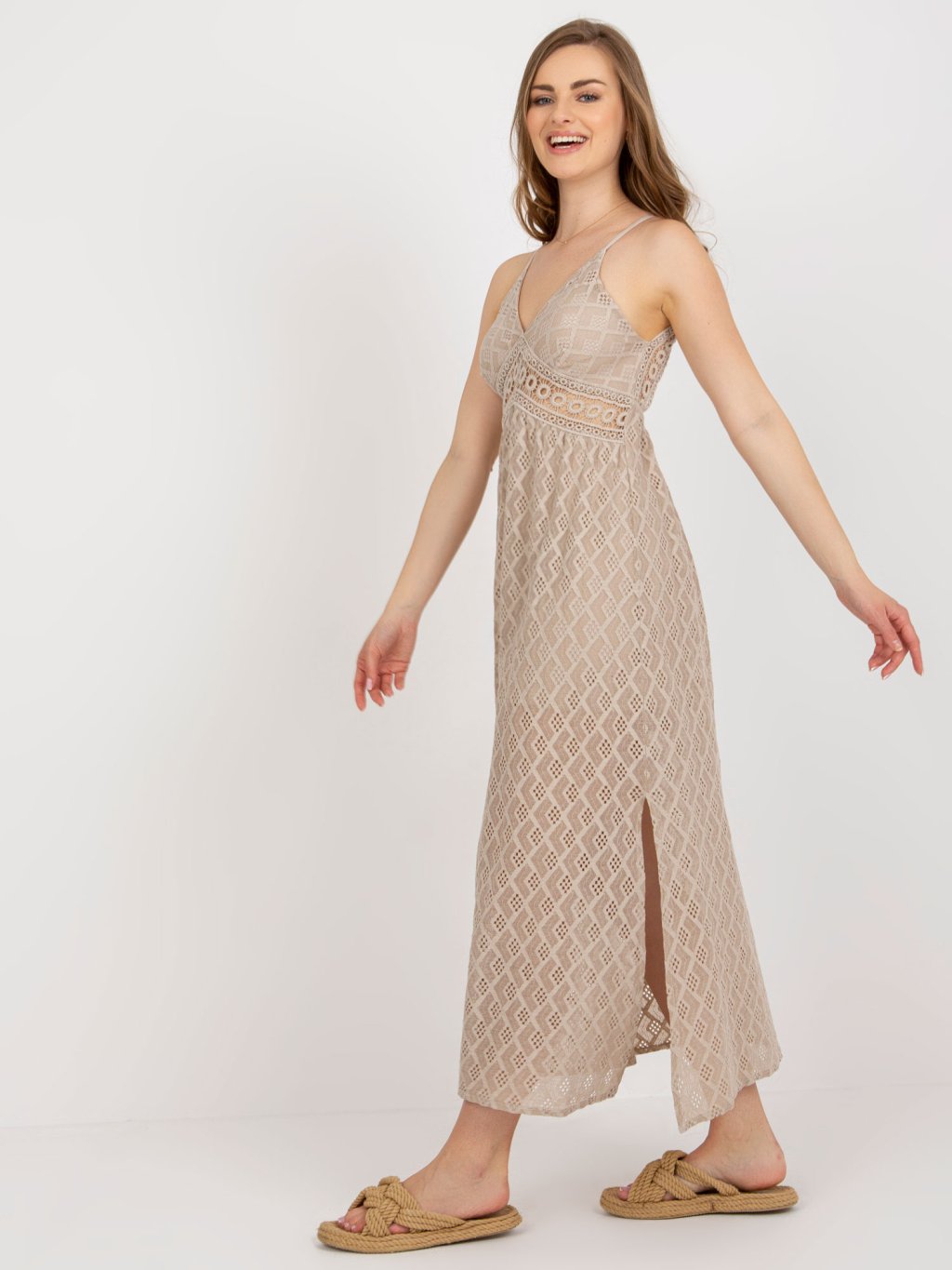 Bézs színű pánt nélküli midi ruha csipkés szoknyával