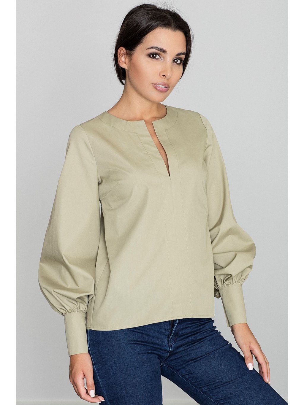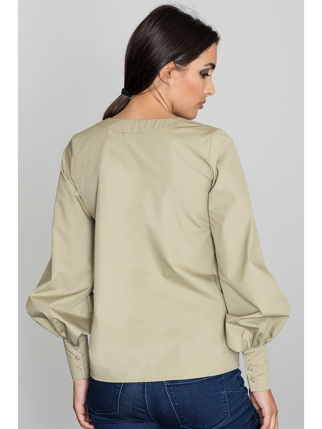 Díszített ujjú olívaszínű blúz