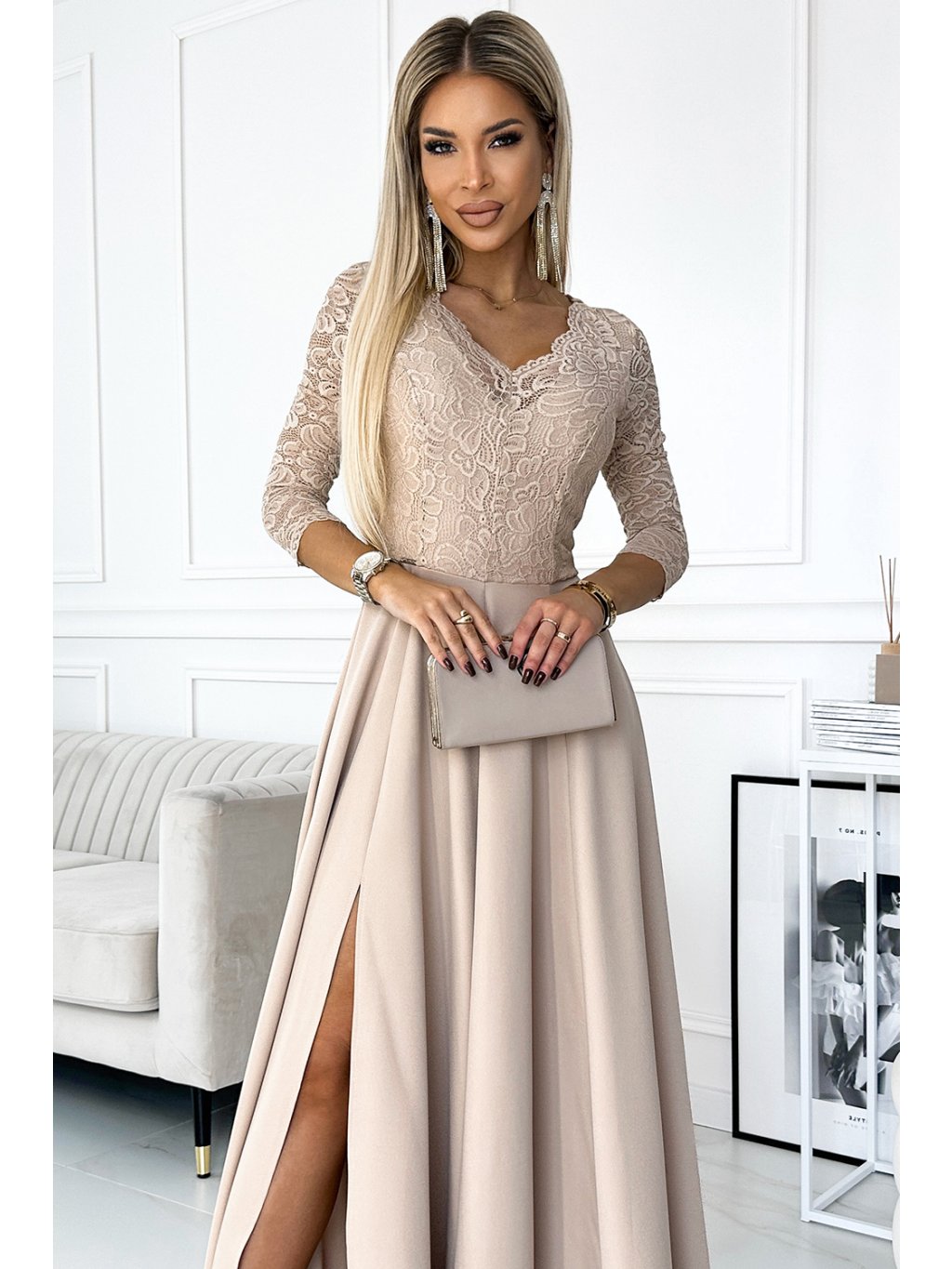 Elegáns bézs csipke hosszú ruha S nyakkivágásszabásem ELISA