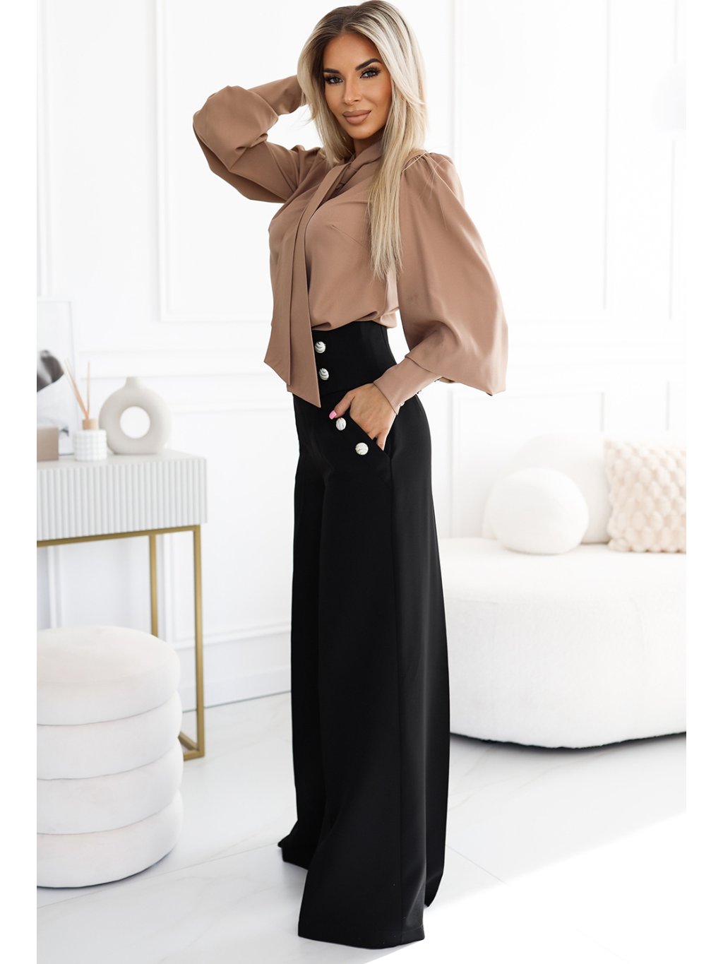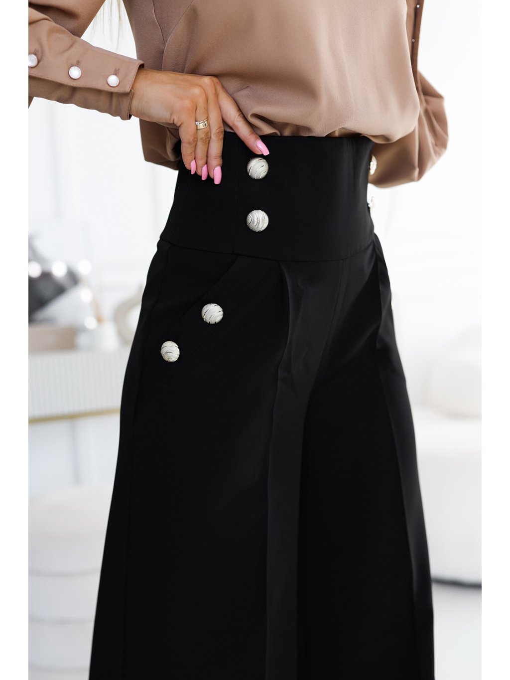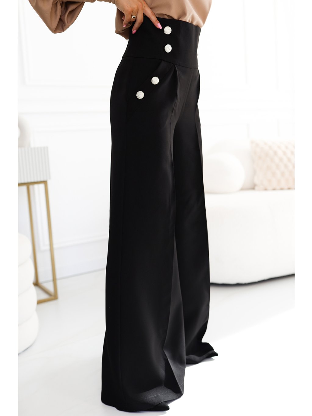 Elegáns fekete széles szárú nadrág magas derékkal, arany gombokkal JENN