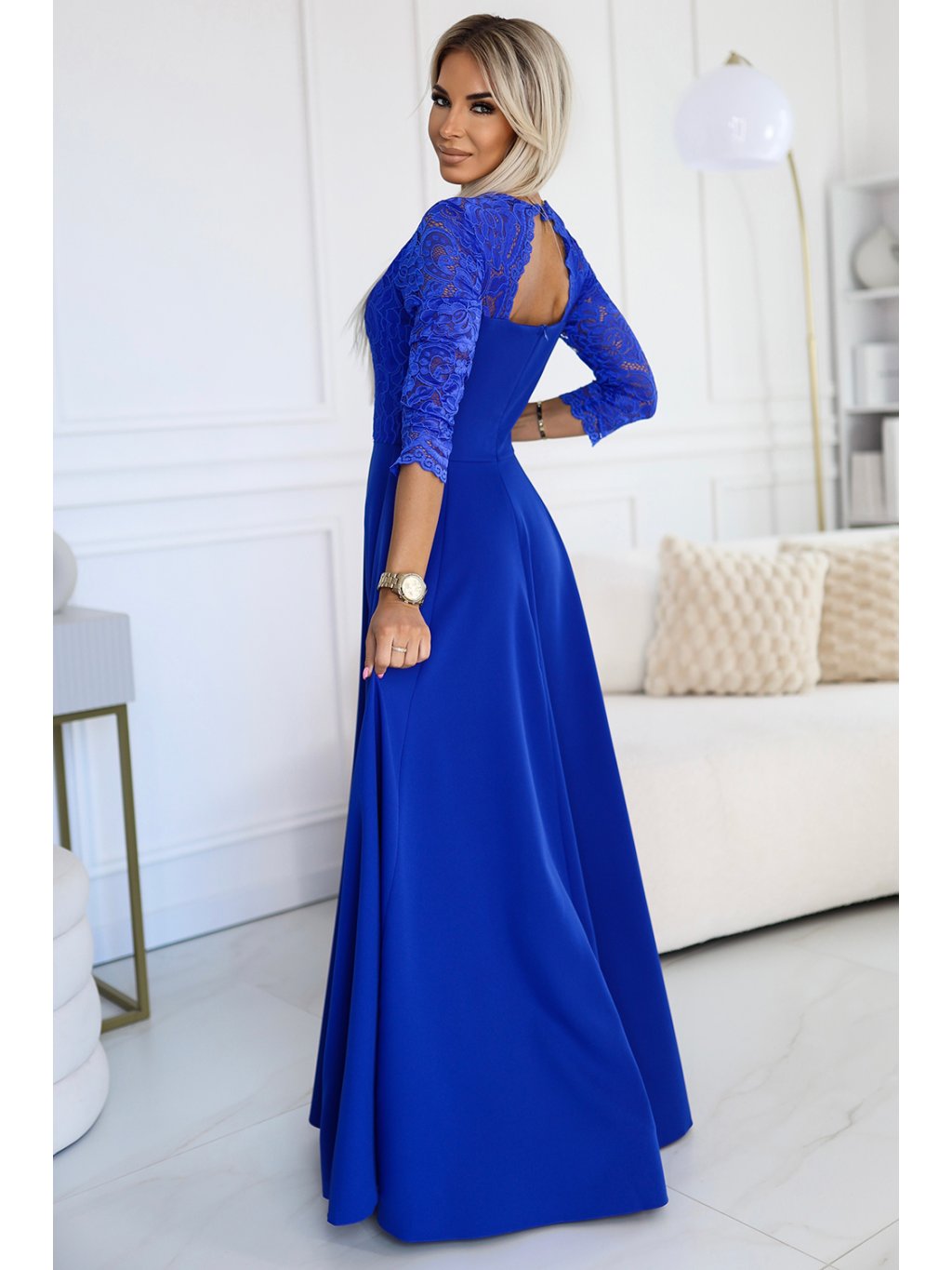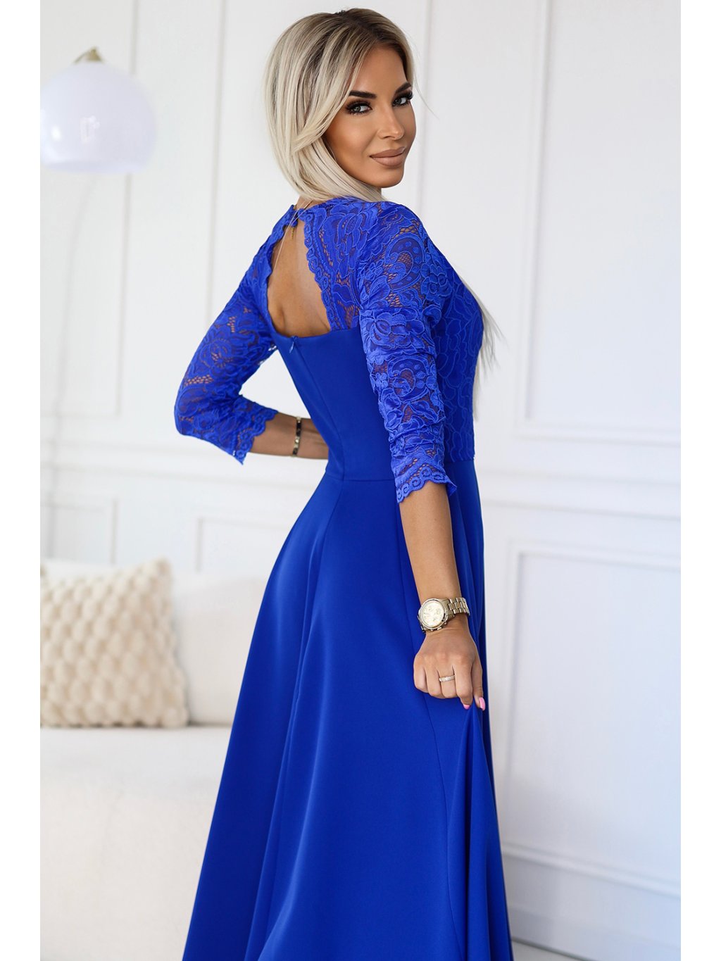 Elegáns kék csipke hosszú ruha nyakkivágással ELISA
