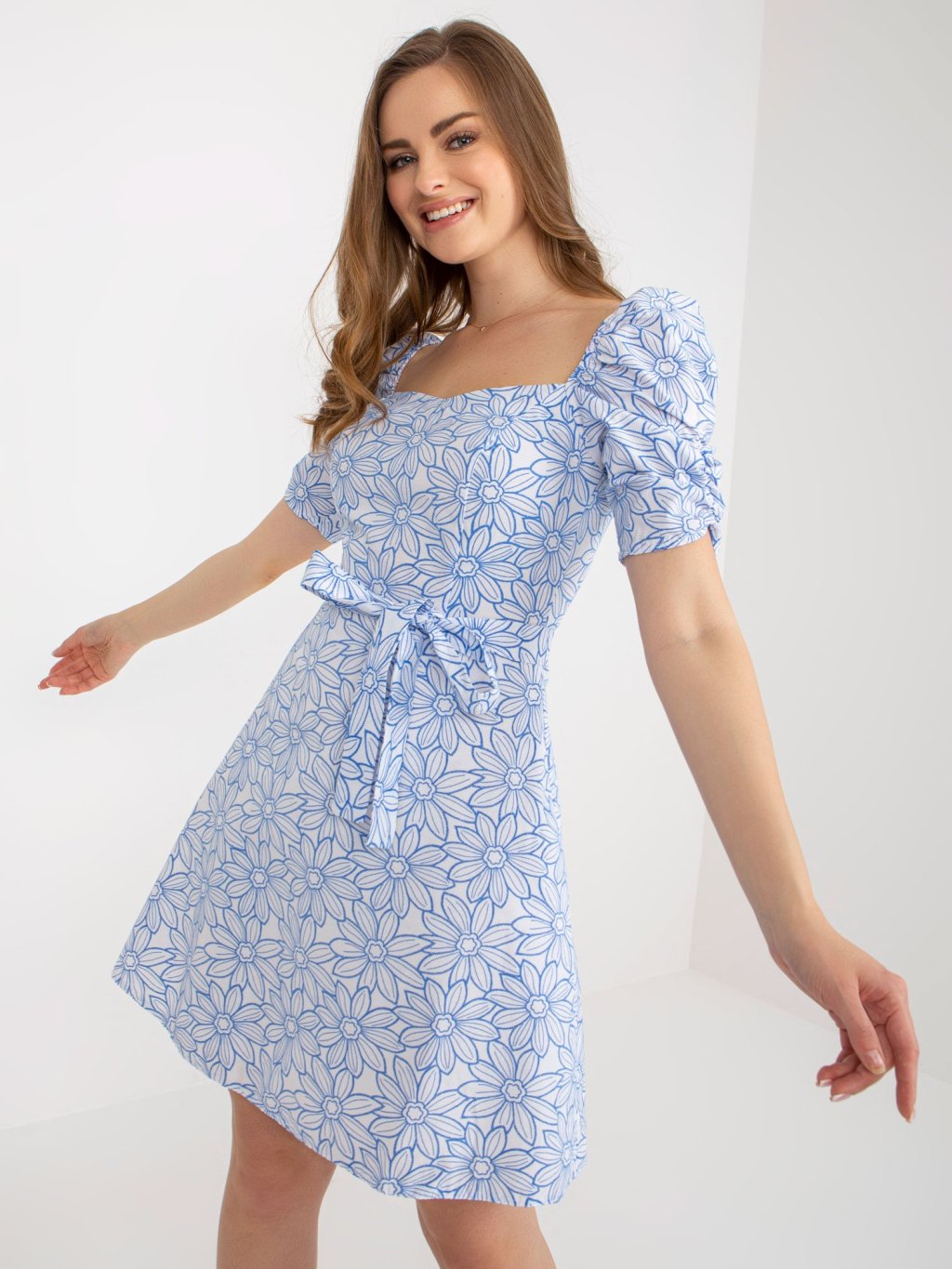 Fehé-kék miniruha virágmintával és fodros ujjakkal