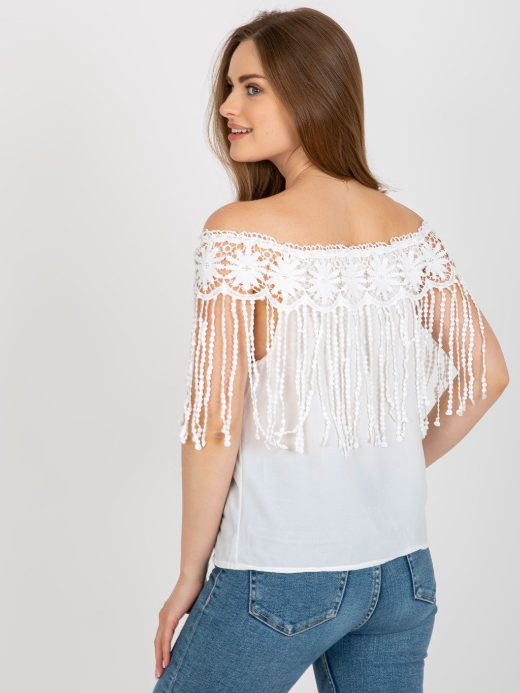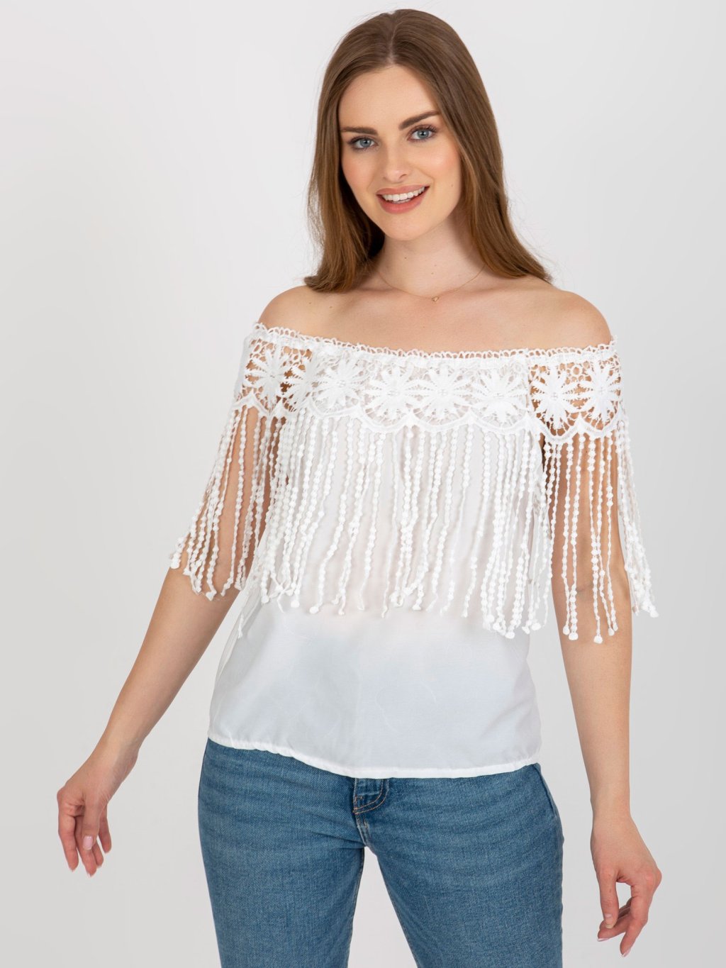 Fehér blúz leeresztett ujjakkal és rojtokkal
