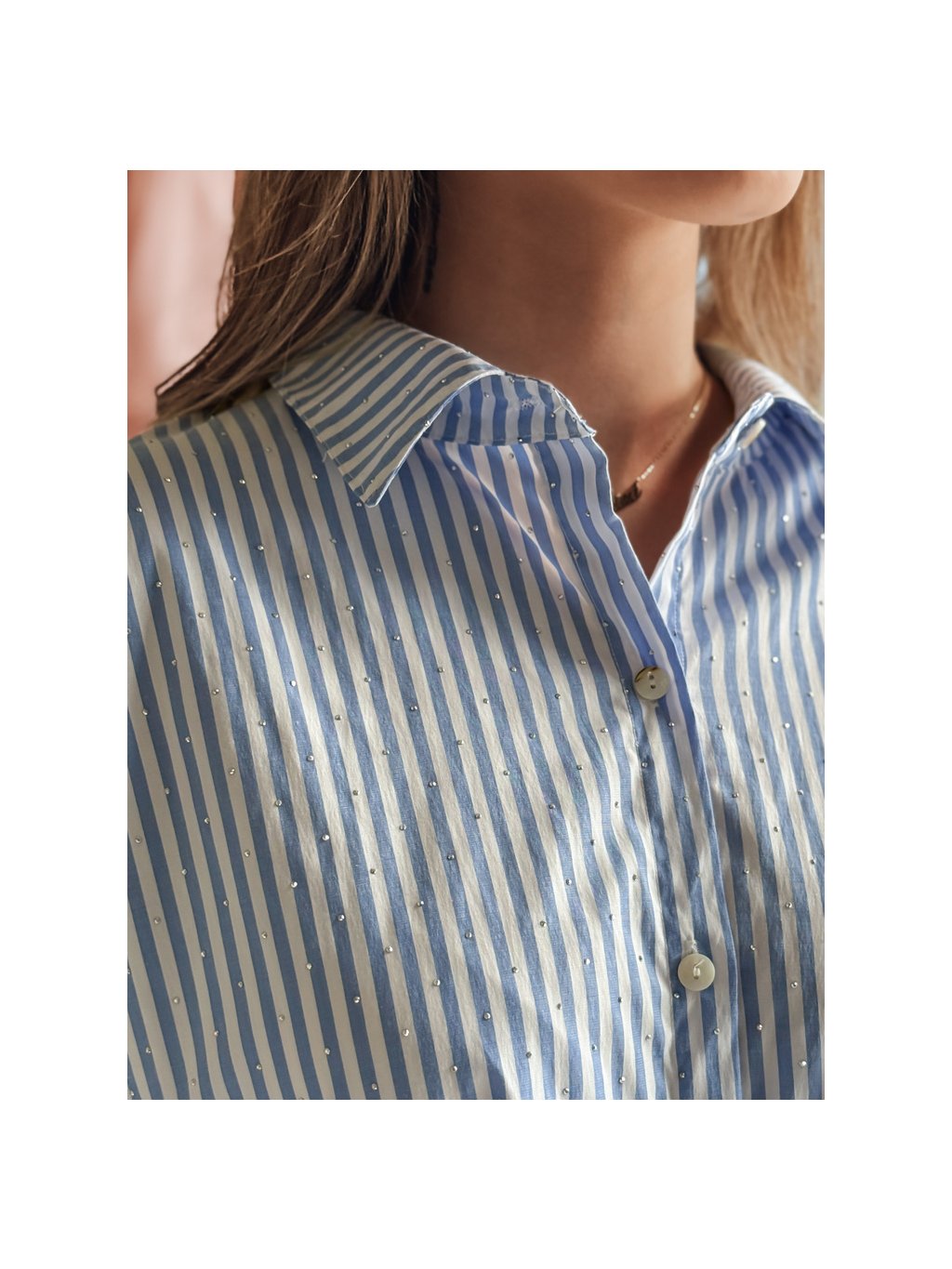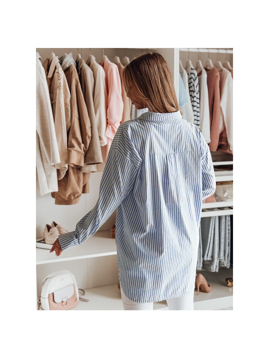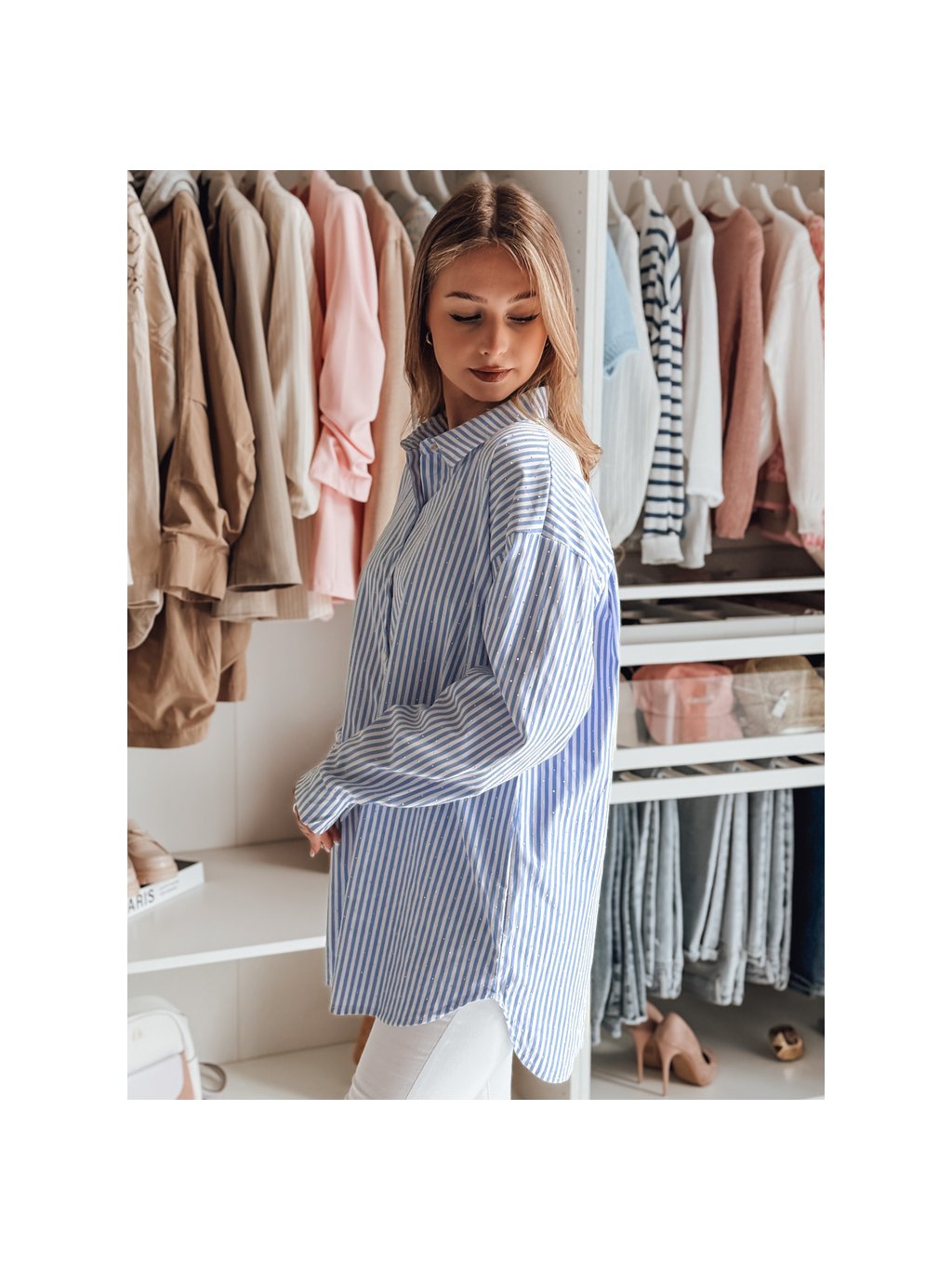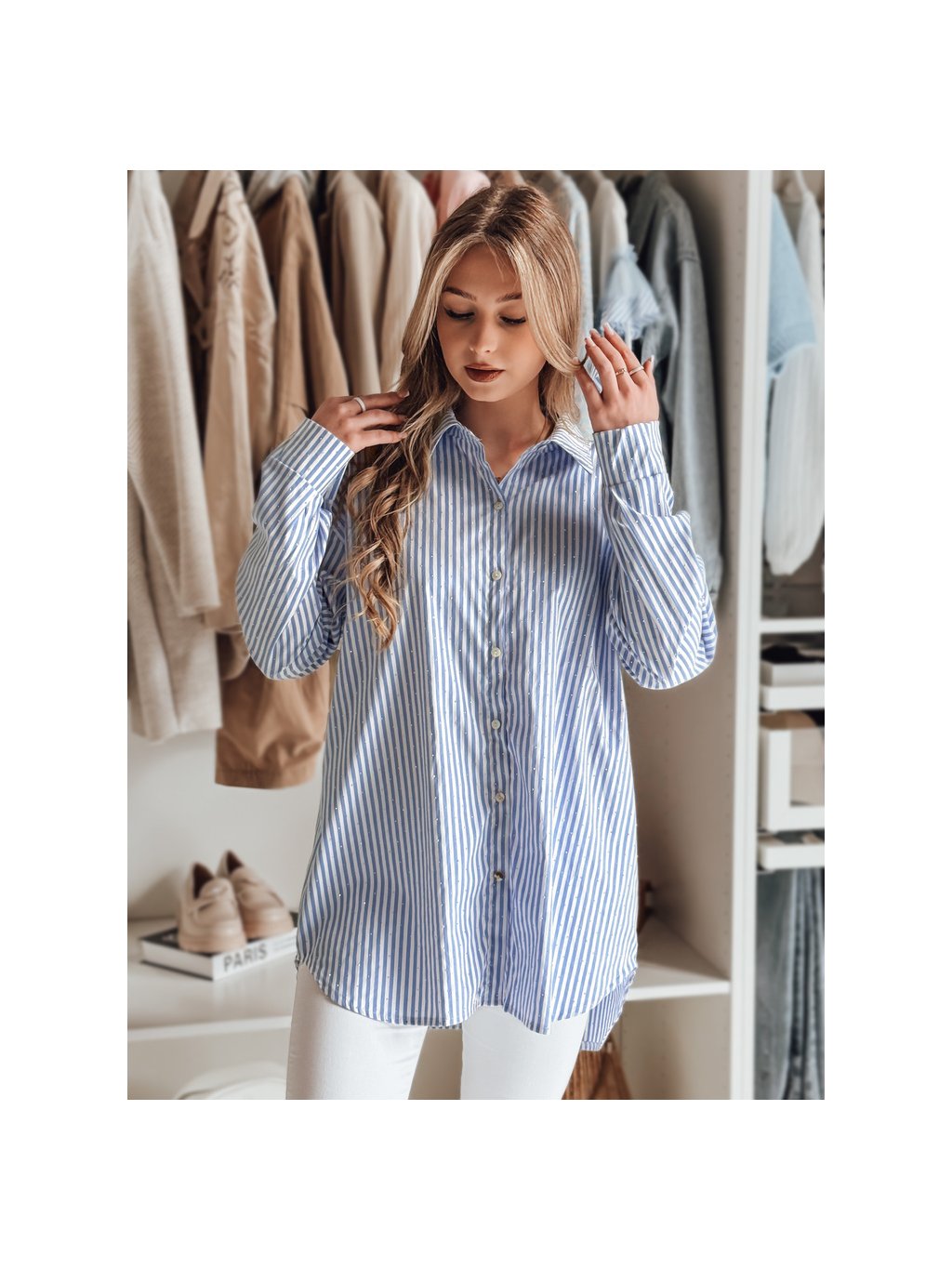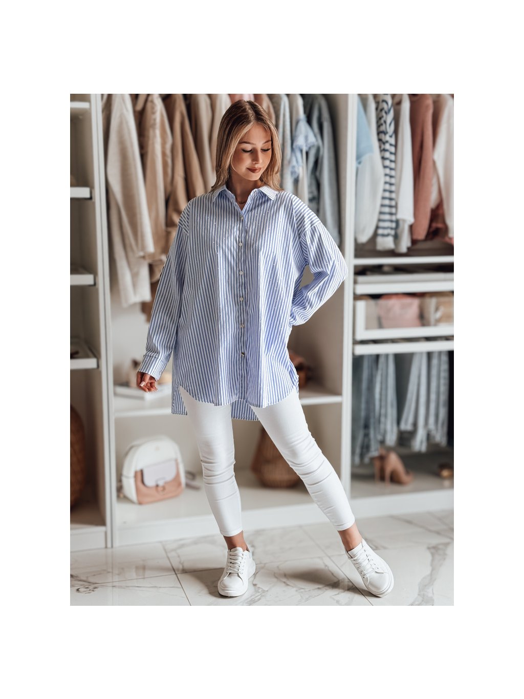 Fehér-kék női hosszú oversize ing strasszokkal BLUSENA