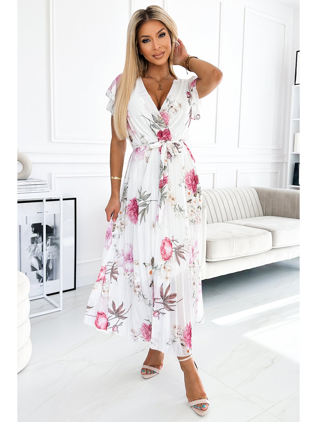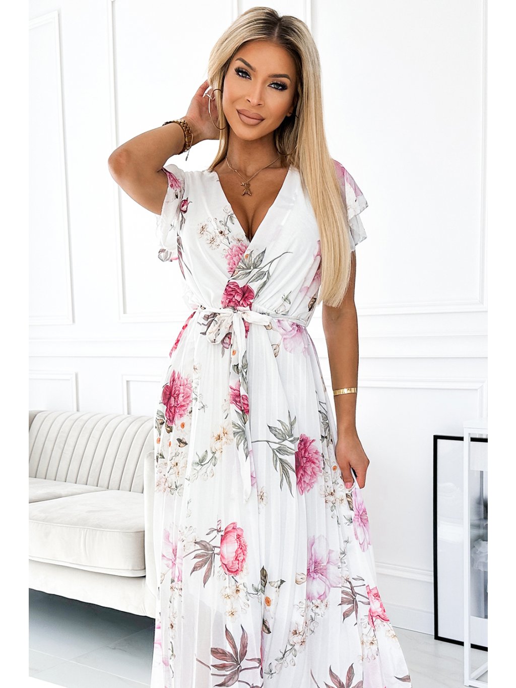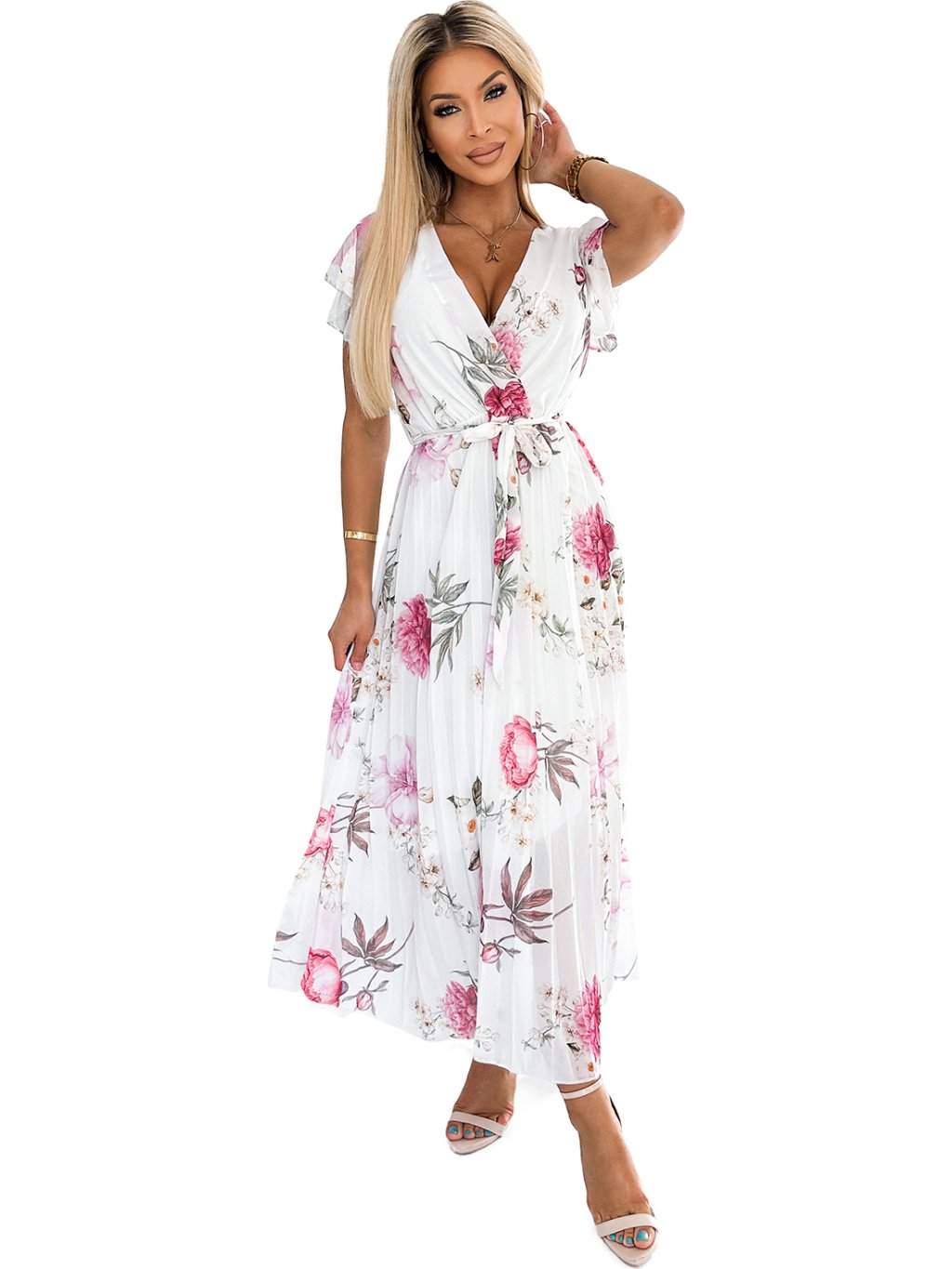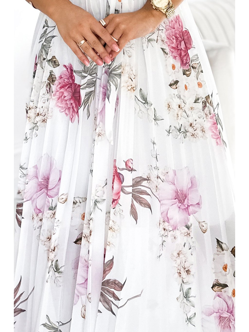 Fehér pliszírozott virágos midi ruha nyakkivágással és fodrokkal MEDIE