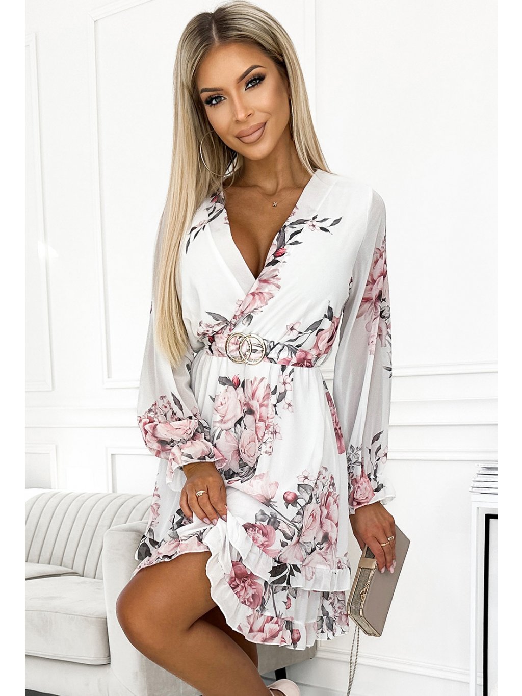 Fehér virágos ruha nyakkivágással és övvel COSETTA