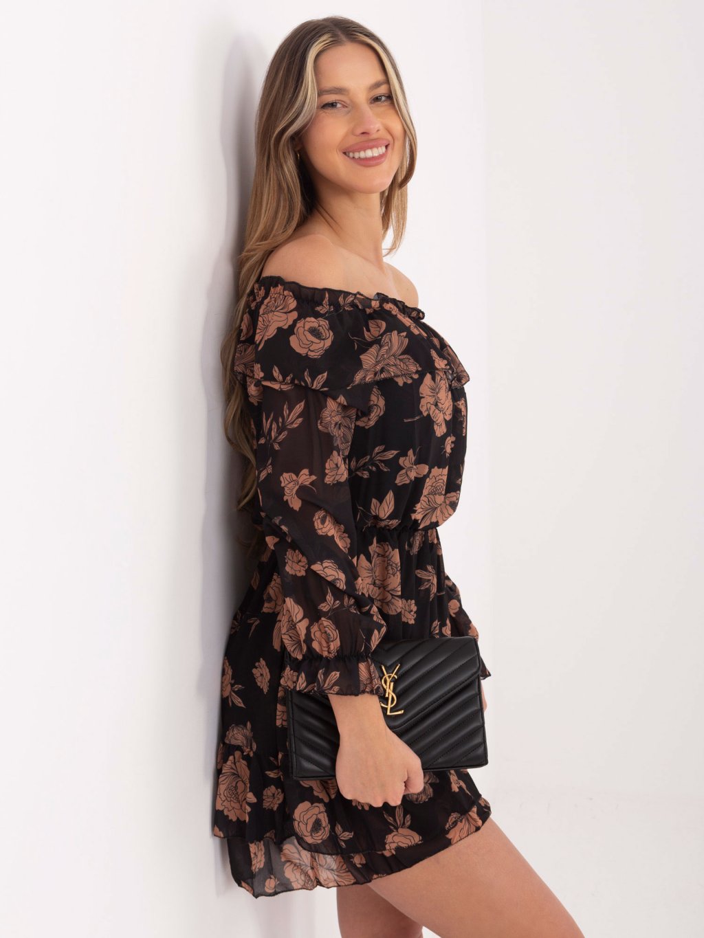 Fekete-bézs miniruha rózsa mintával