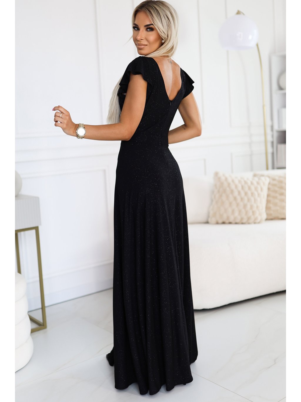 Fekete hosszú ruha nyakkivágással és csillámokkal CRYSTAL