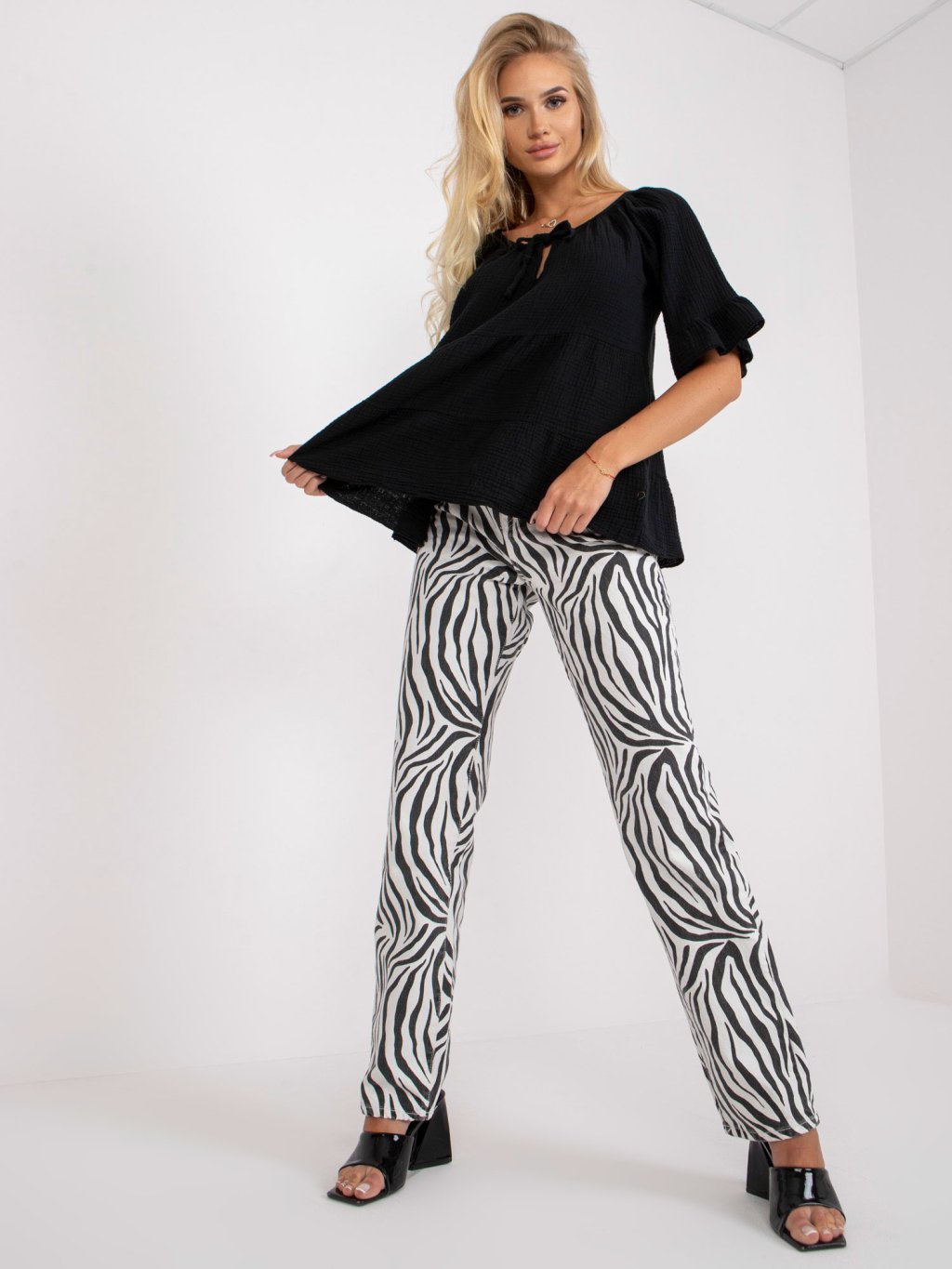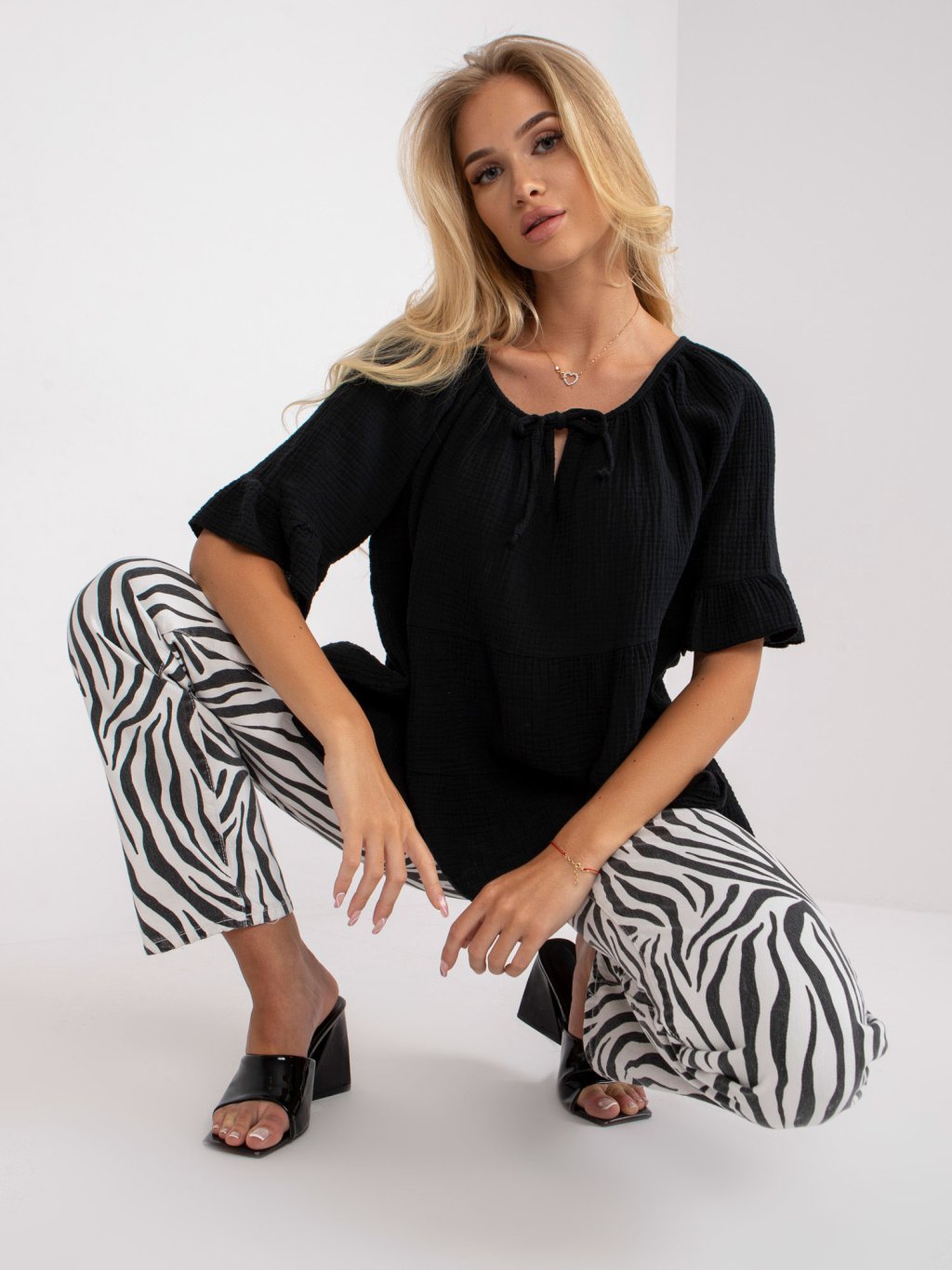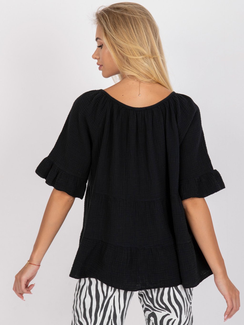 Fekete női bő redőzött póló