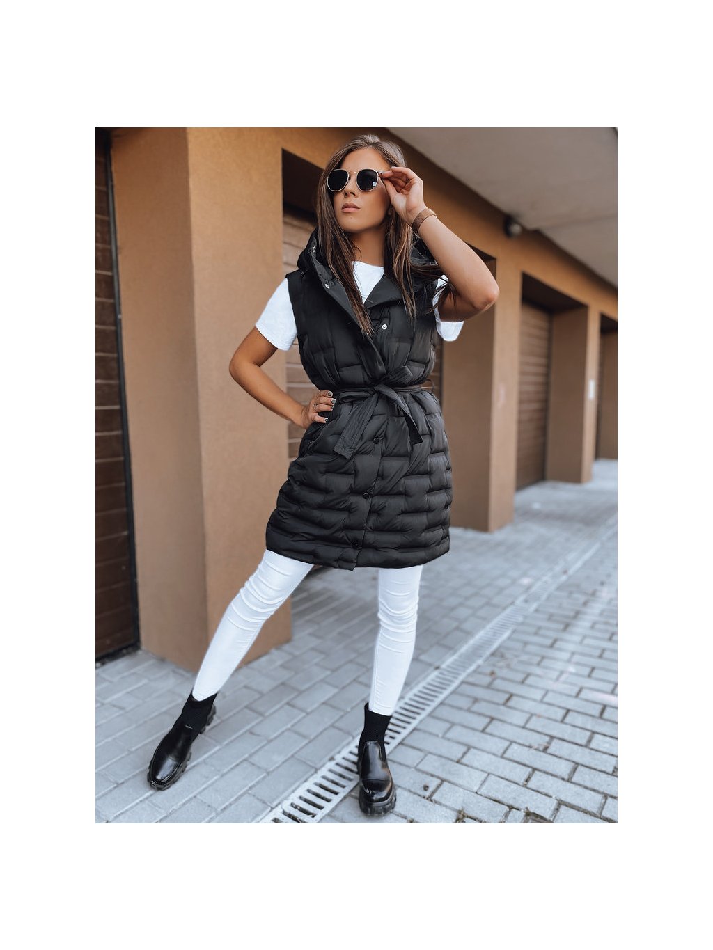 Fekete női steppelt hosszabb mellény