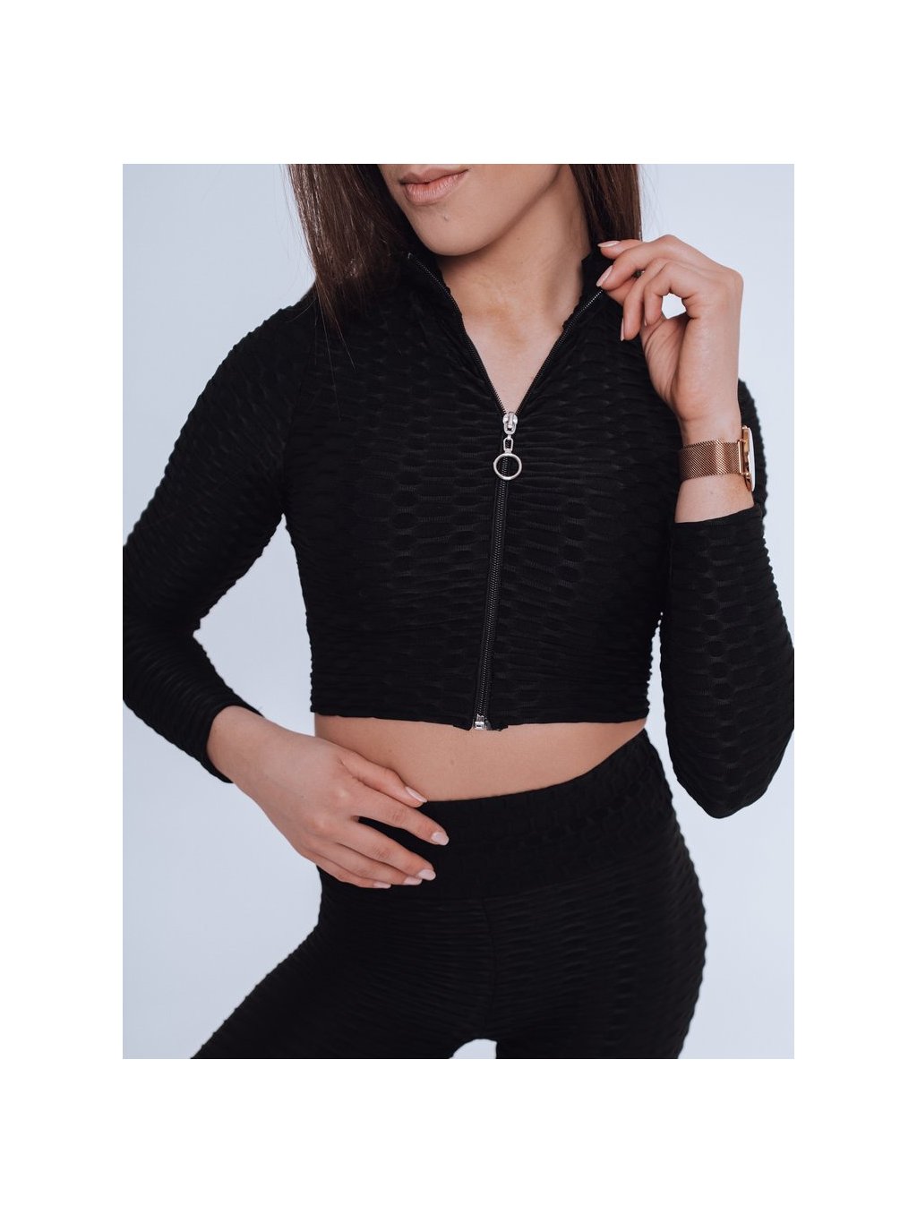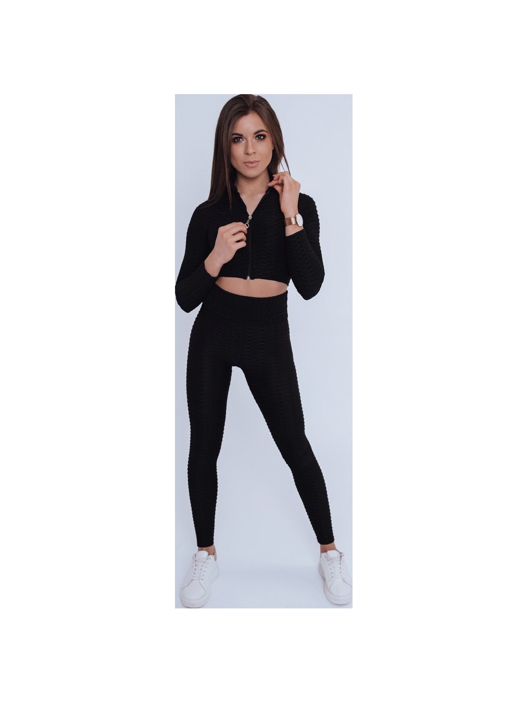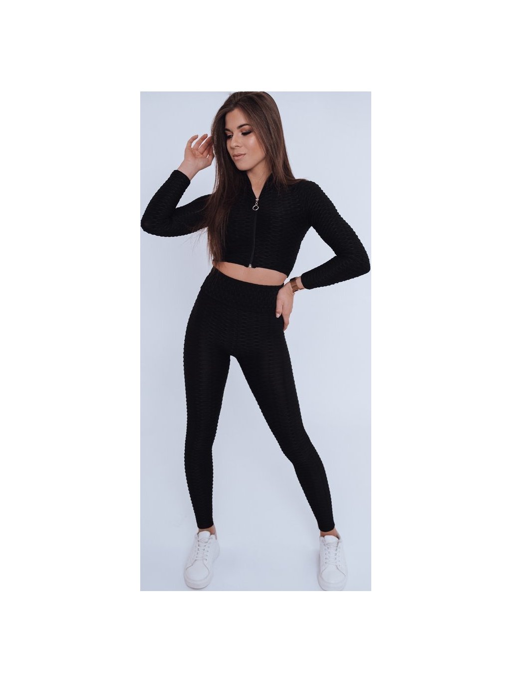 Fekete női strukturált leggings és pulóver szett cipzárral