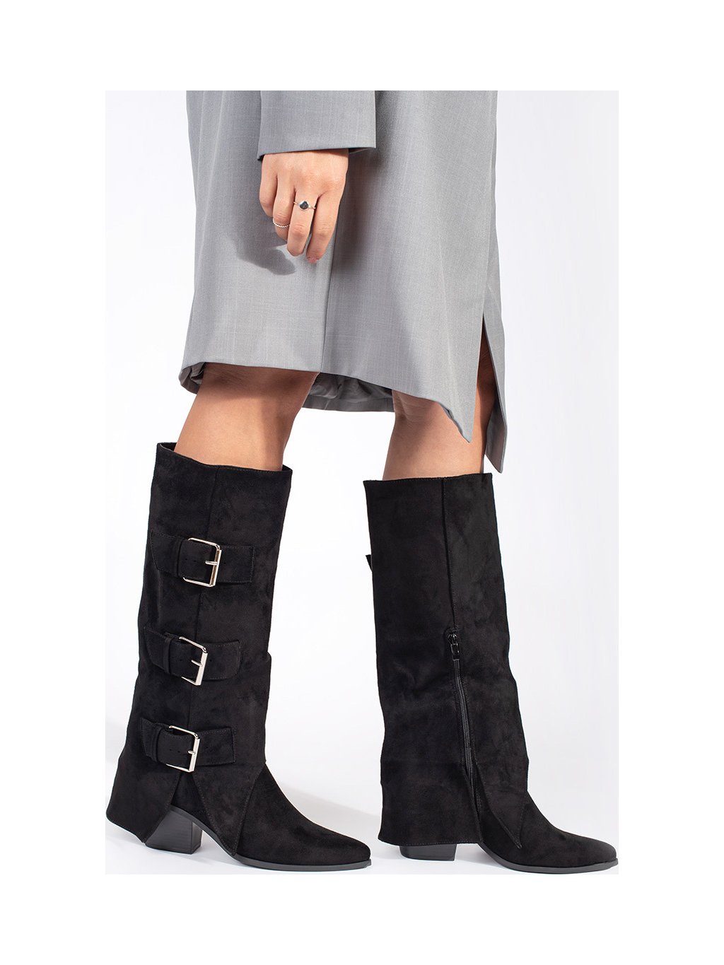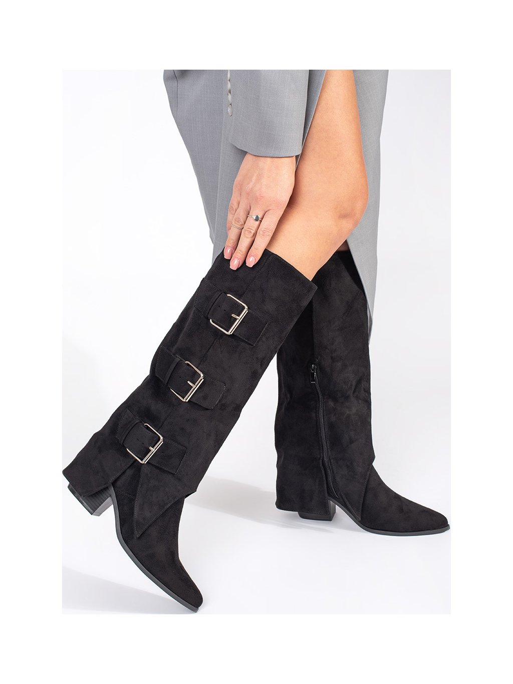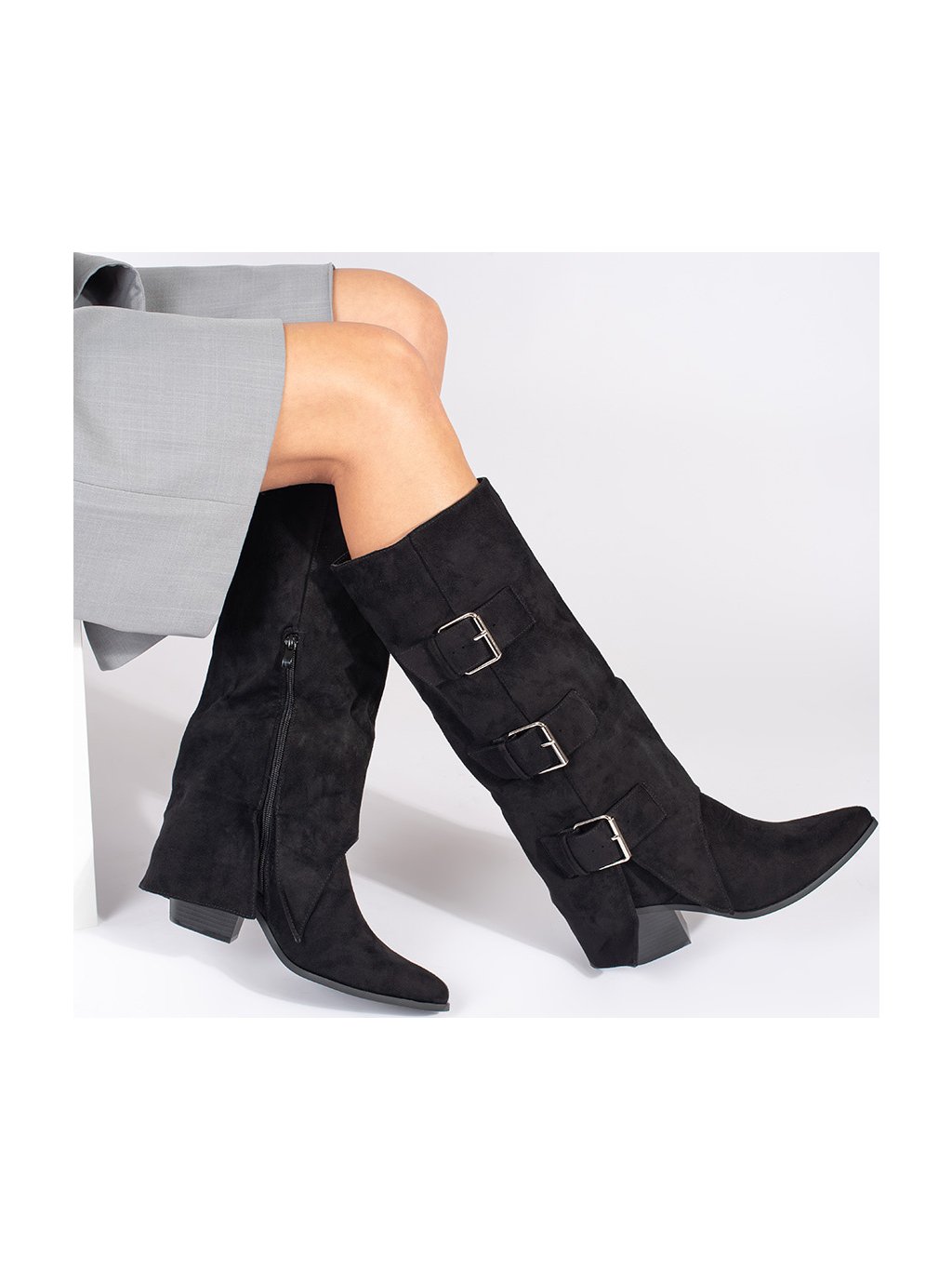 Fekete női velúr blokksarkú csizma csatokkal, sarok 7,5 cm