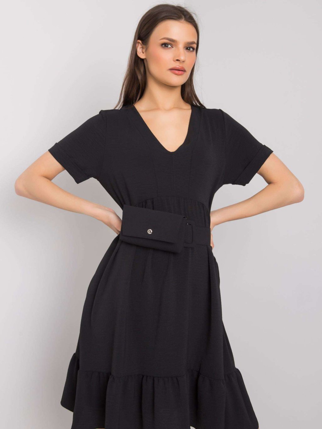 Fekete ruha övvel és táskával