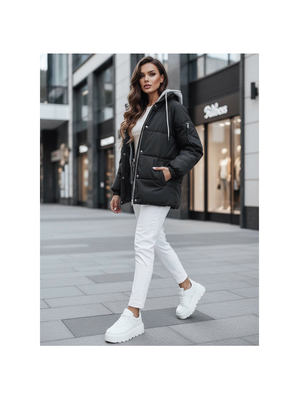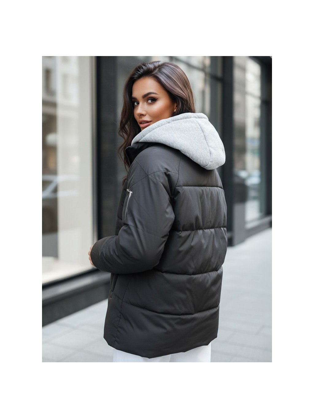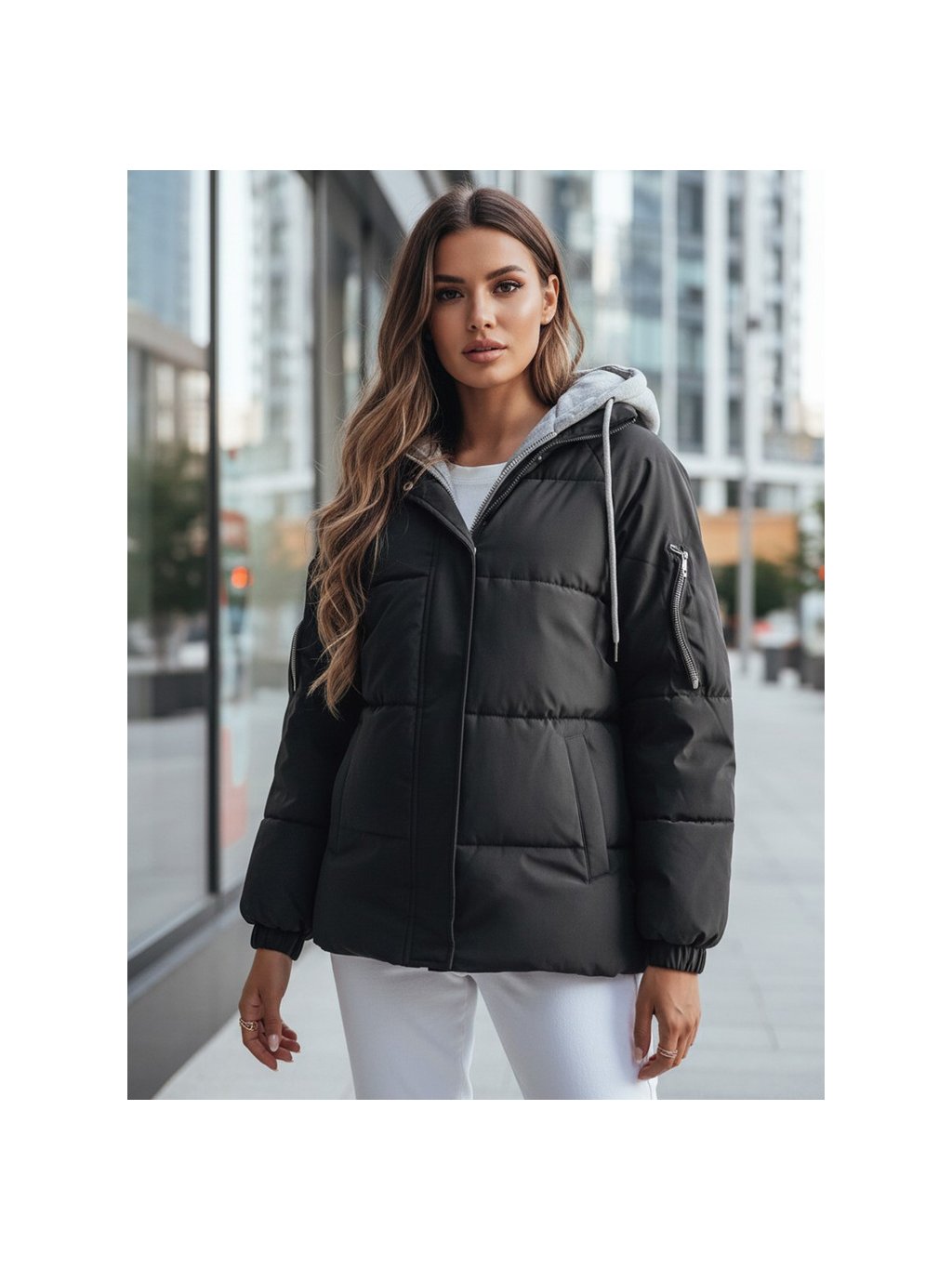 Fekete steppelt kabát textil kapucnival SPACE