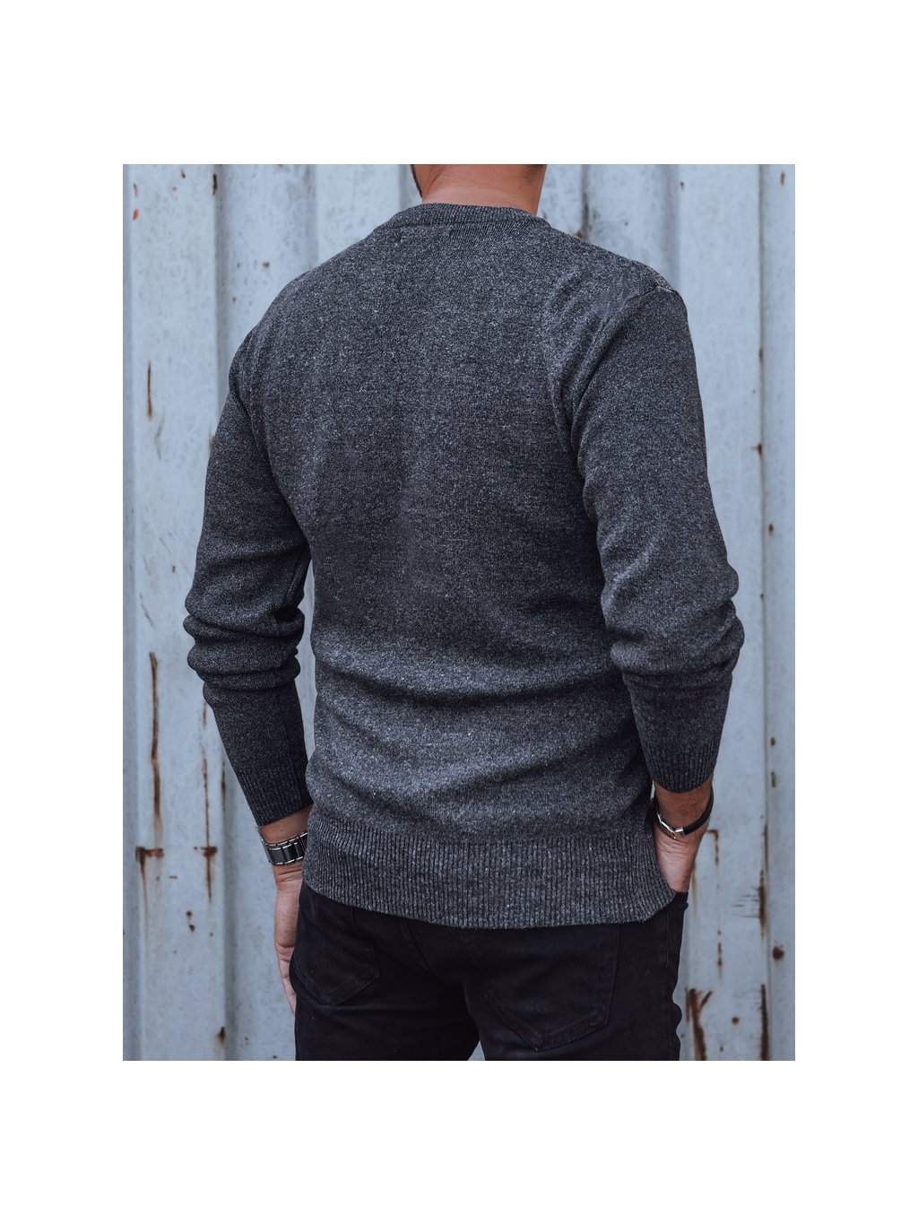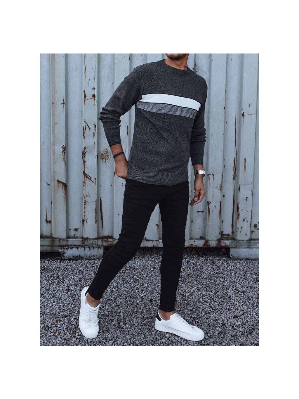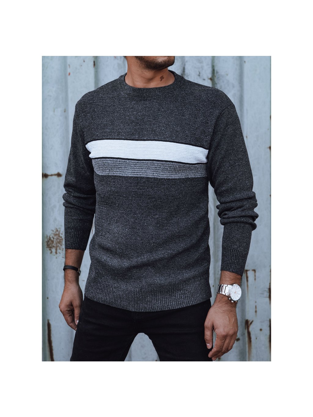 Férfi sötétszürke pulóver mellén csíkokkal