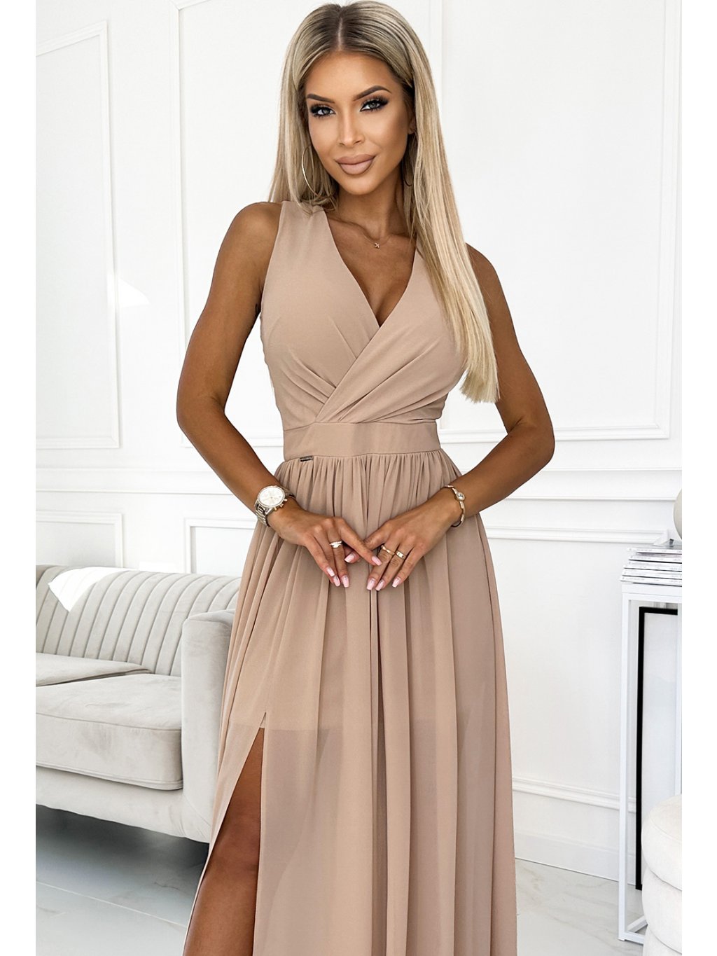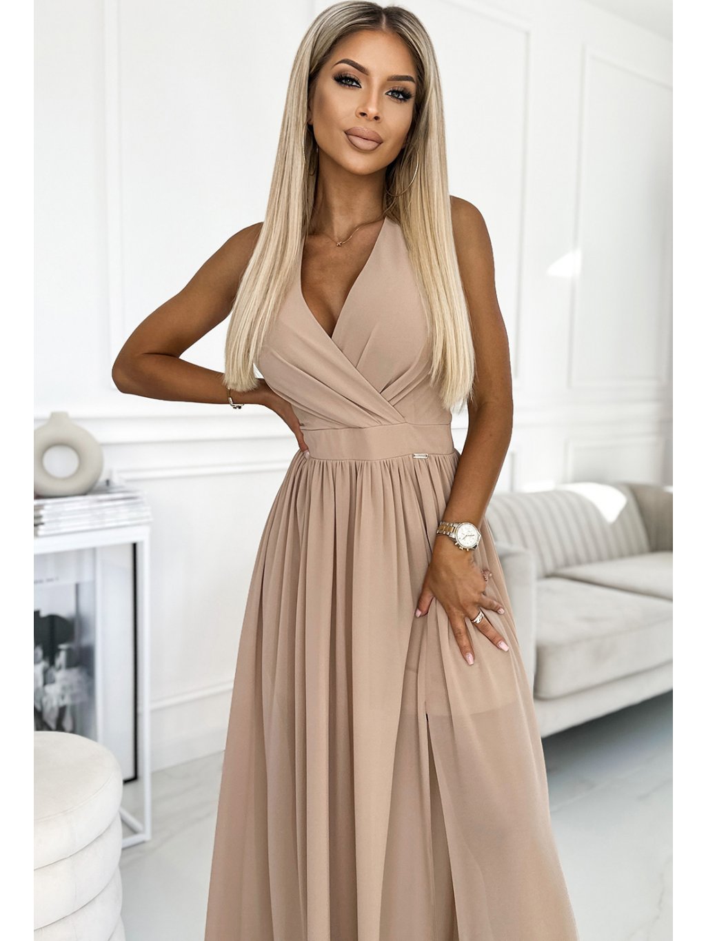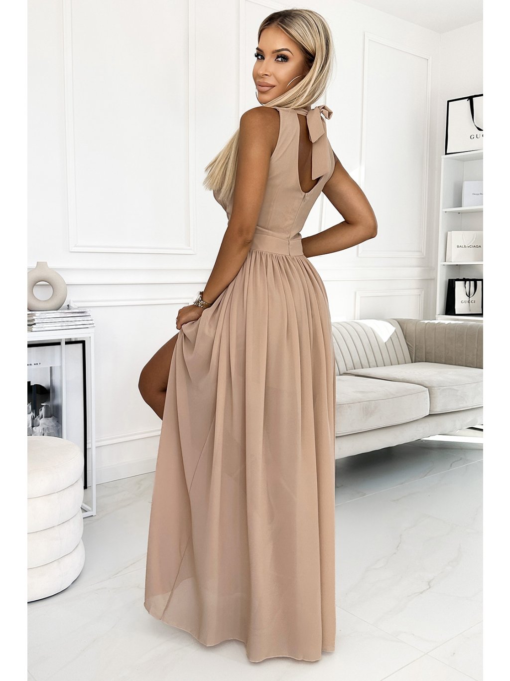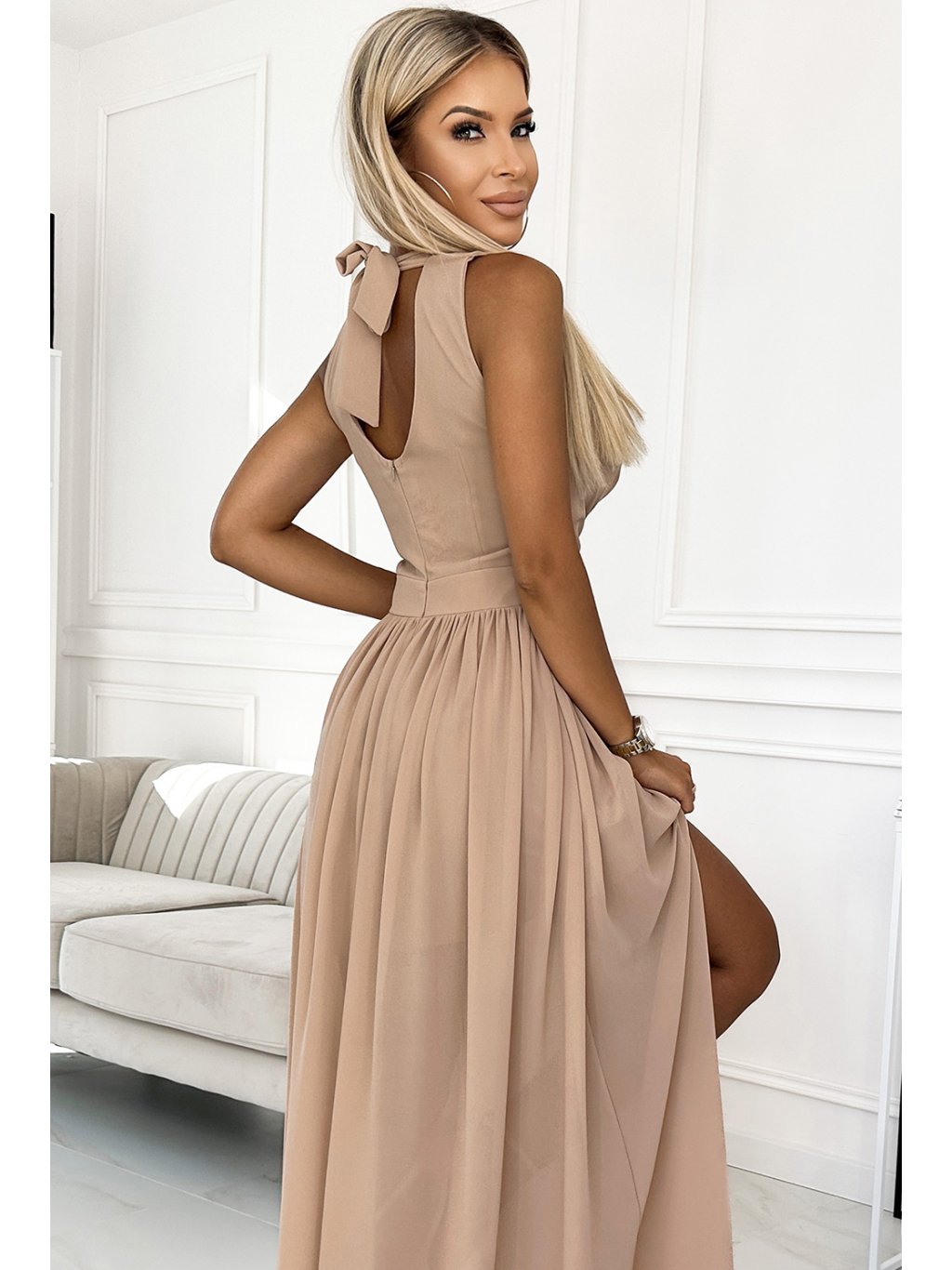 Hosszú, sötét bézs színű party ruha S nyakkivágássalszabásem GERDA