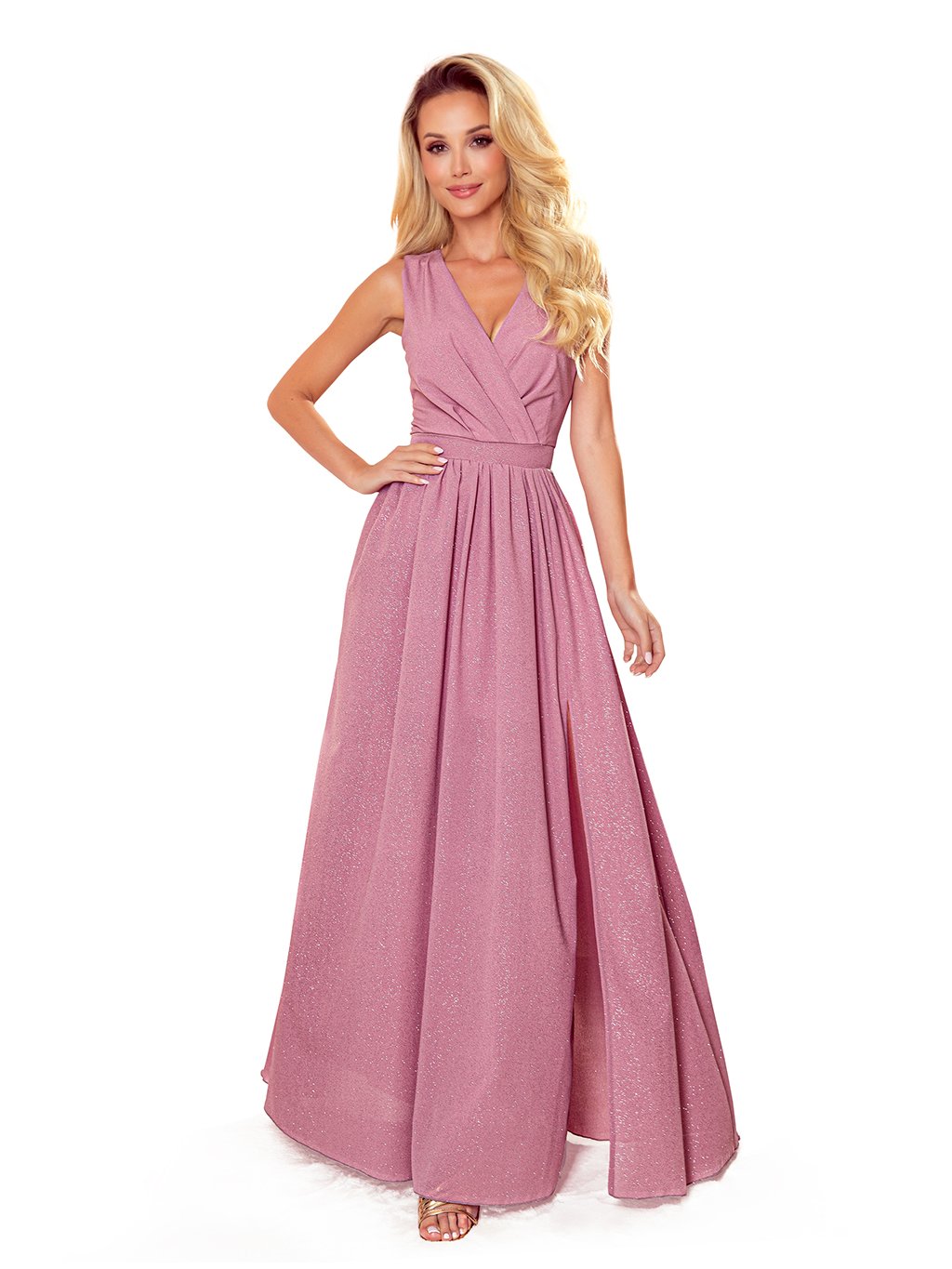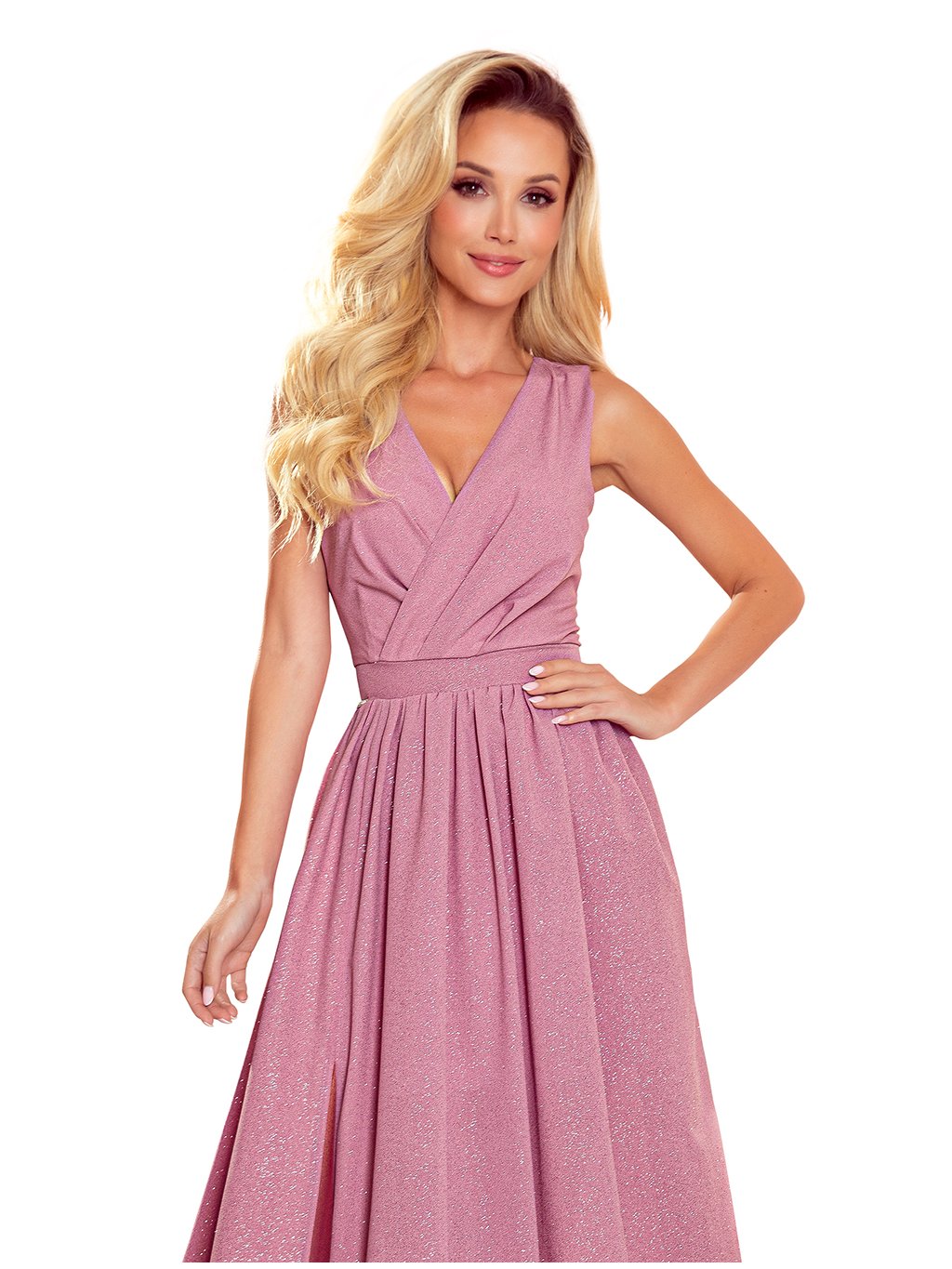 Hosszú csillogó rózsaszín alkalmi ruha V-nyakkivágással GERDA