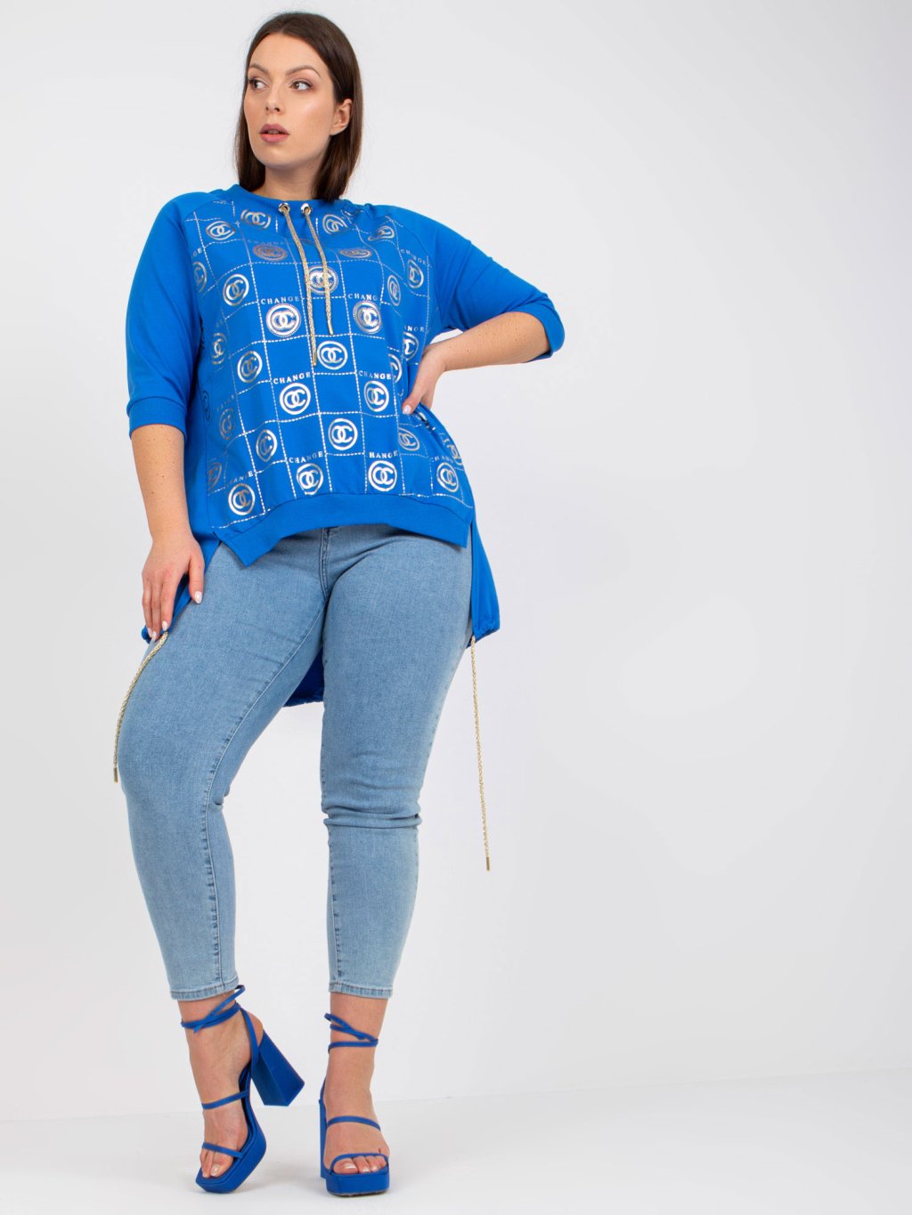Kék aszimmetrikus tunika nyomtatott felirattal