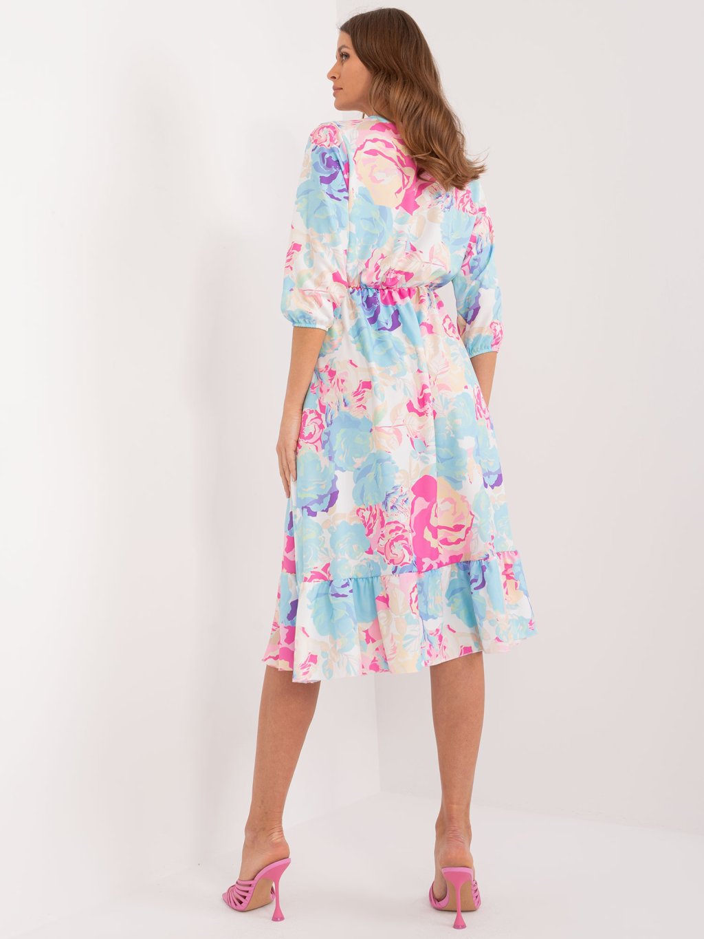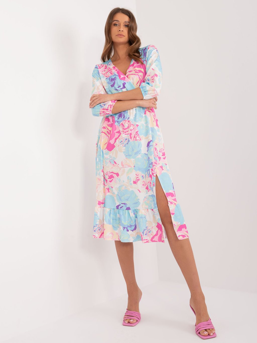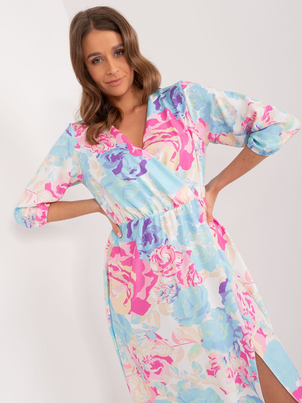 Kék-rózsaszín virágos midi ruha hasítékkal