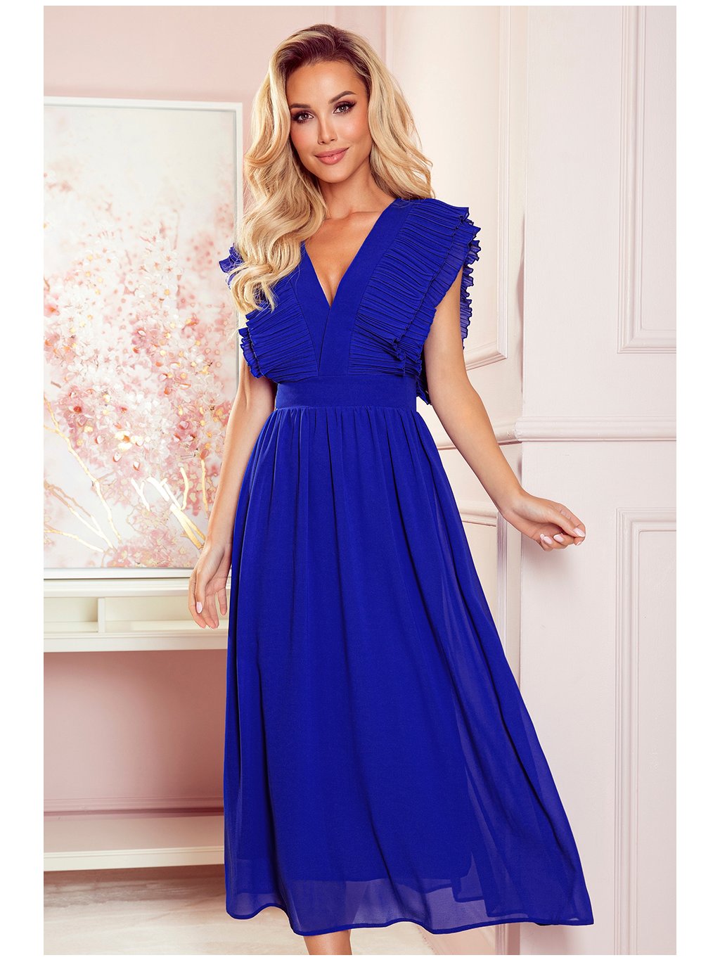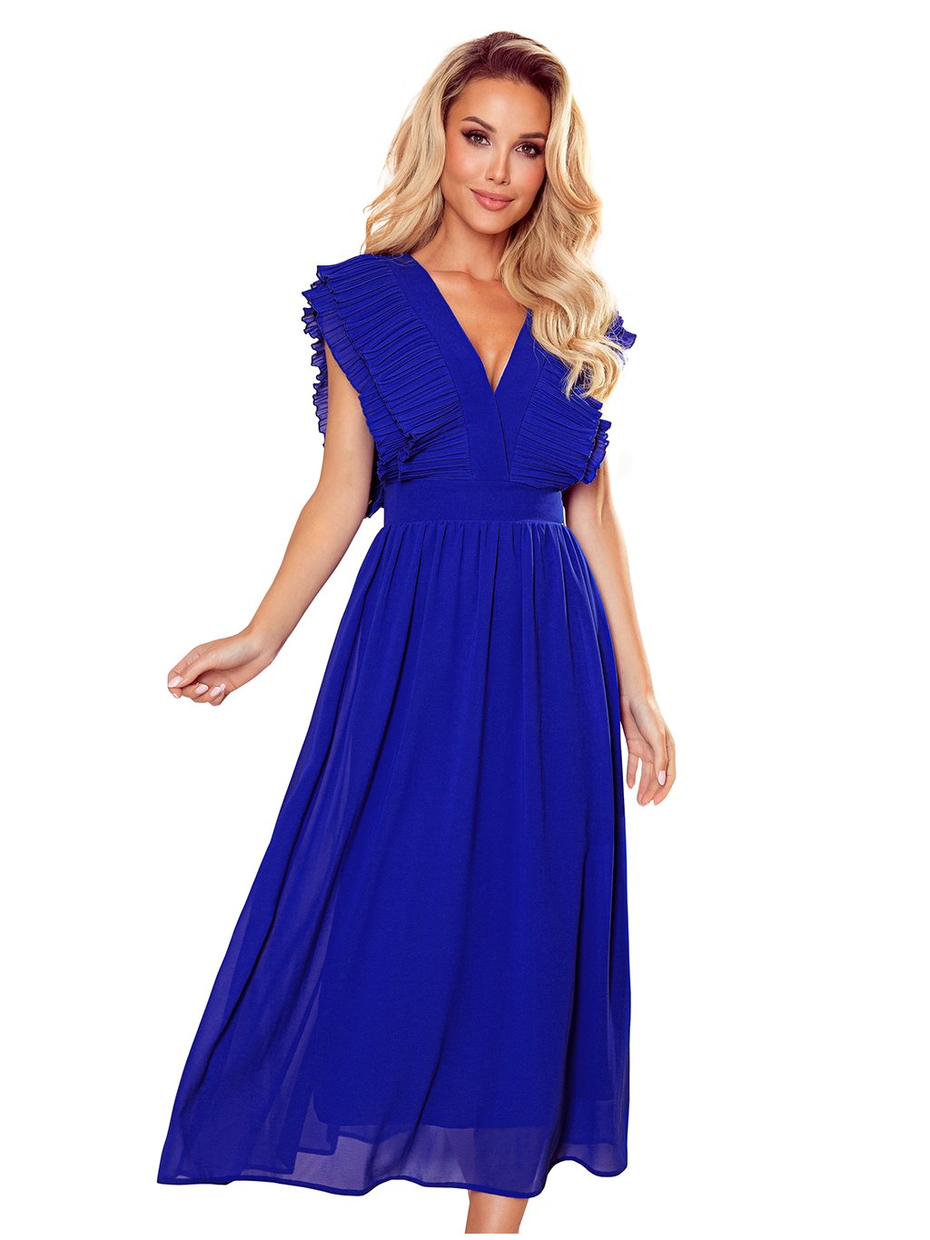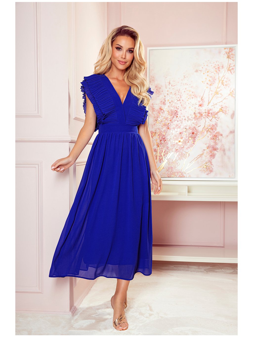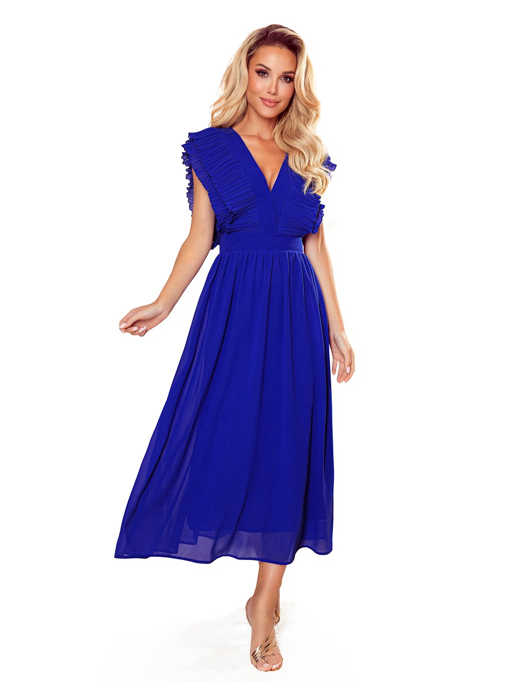 Kék ruha hajtogatott fodrokkal és nyakkivágással TAMARA