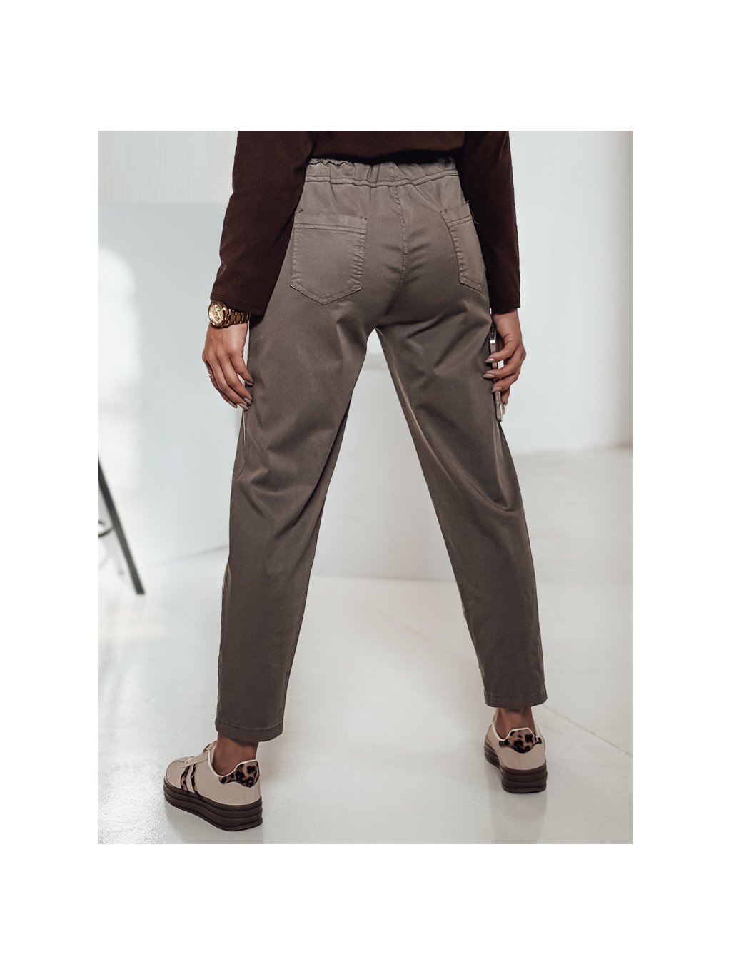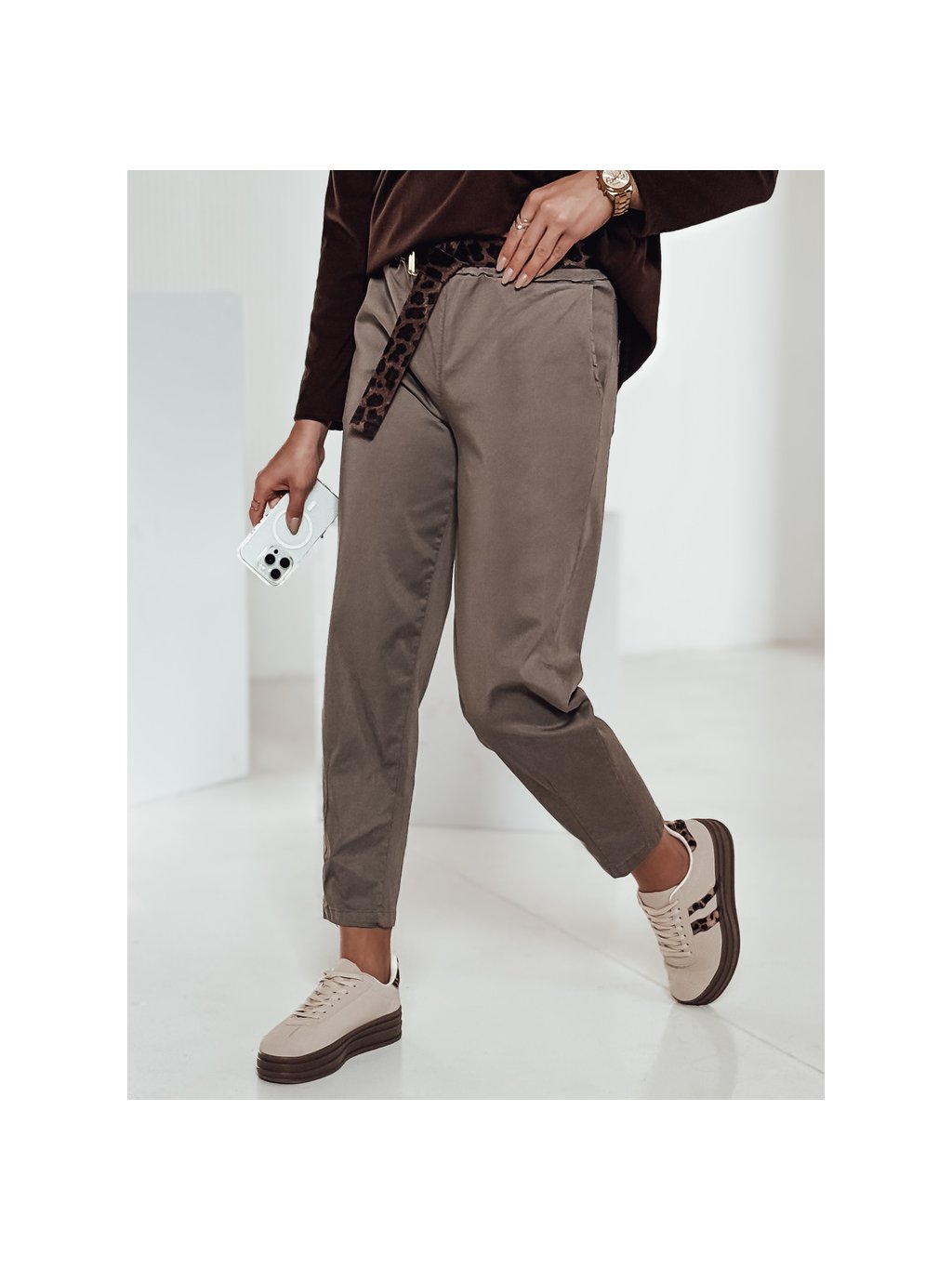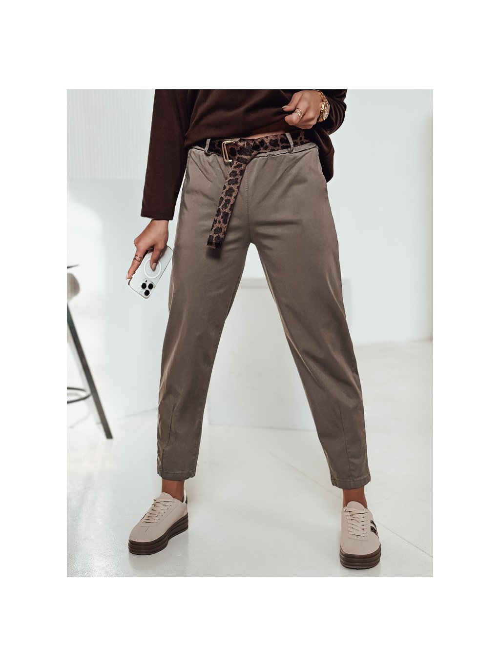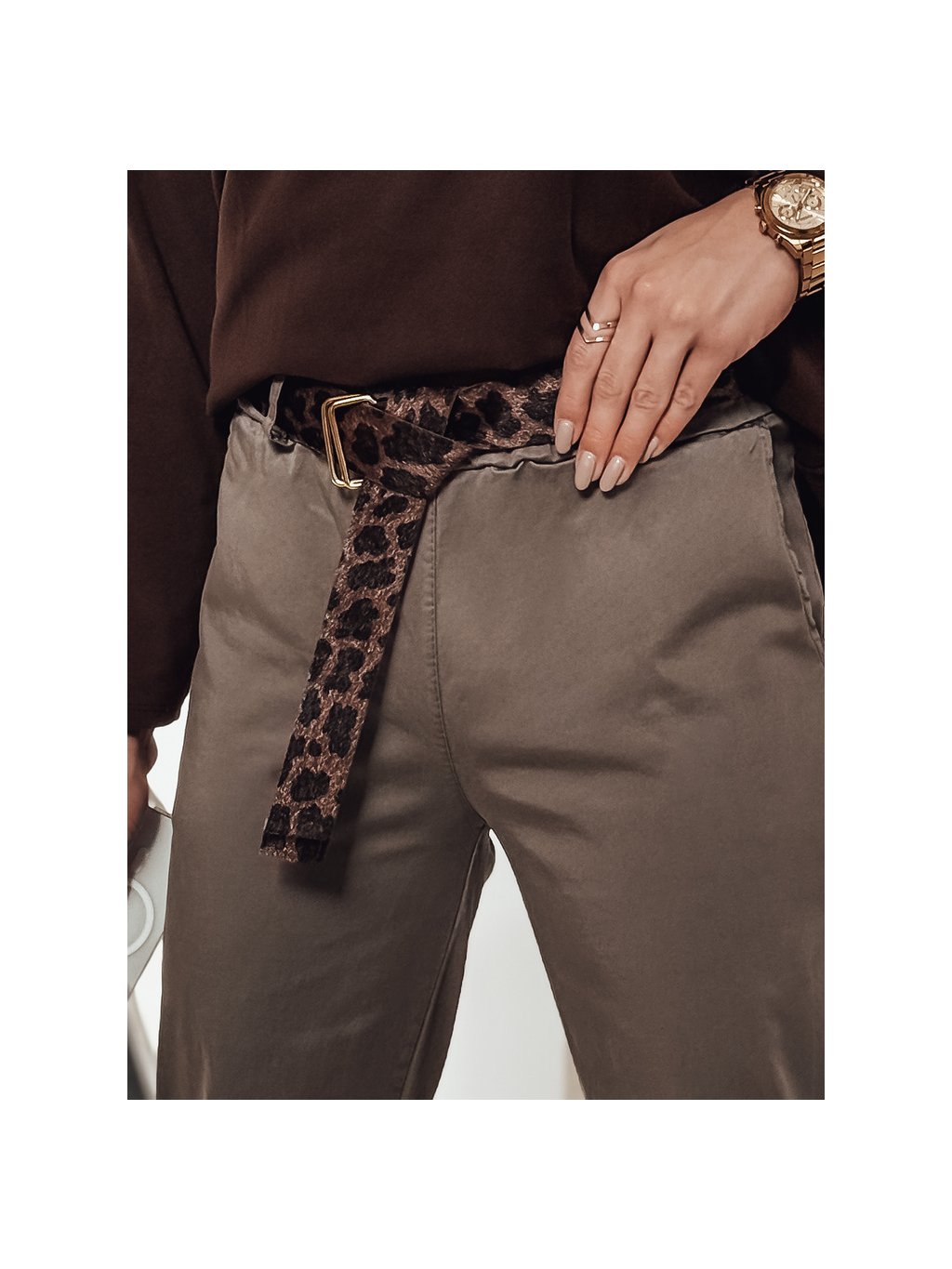 Khaki női egyenes nadrág övveé LEOCINCIN