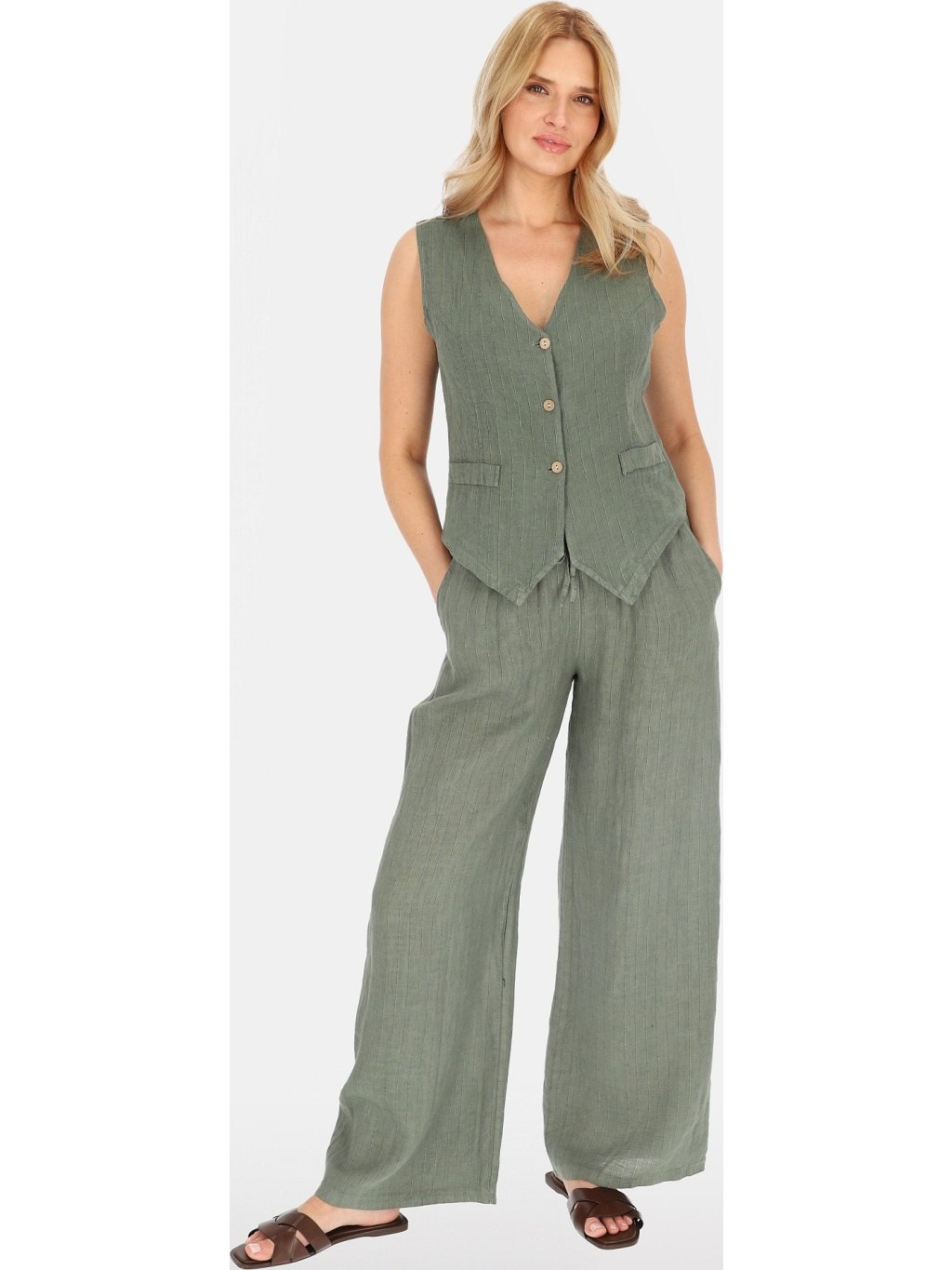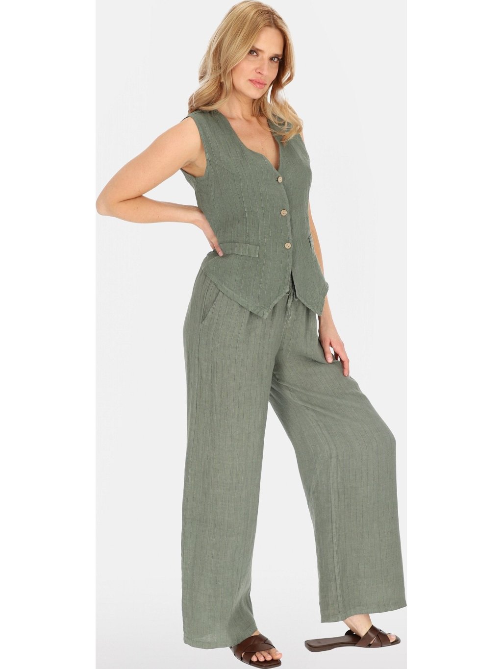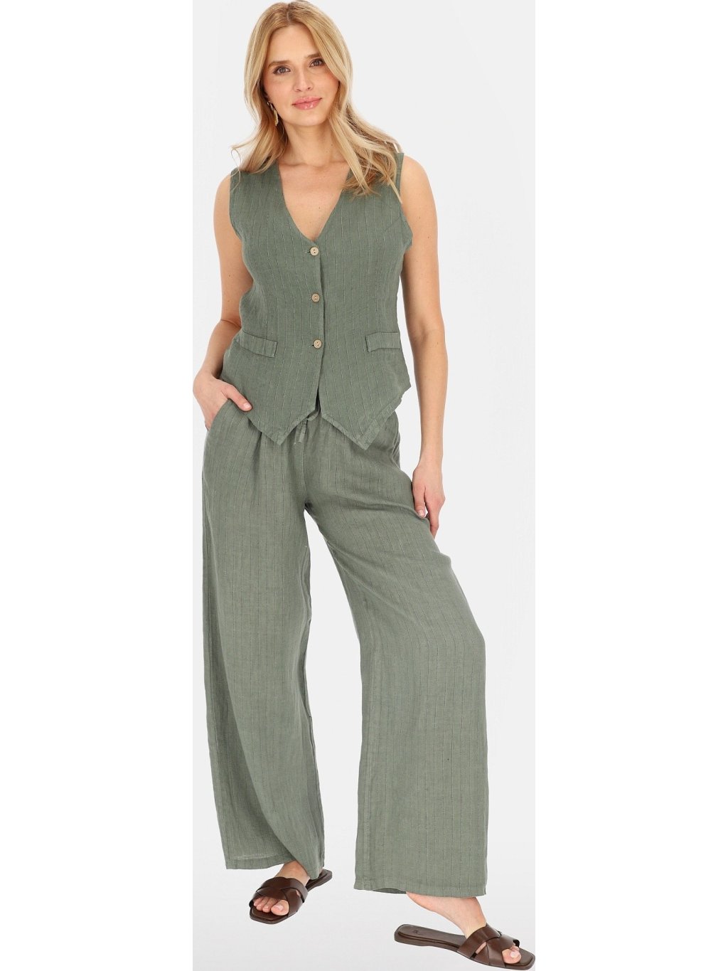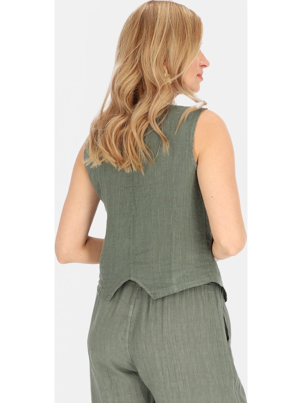 Khaki színű elegáns vászon mellény csíkos