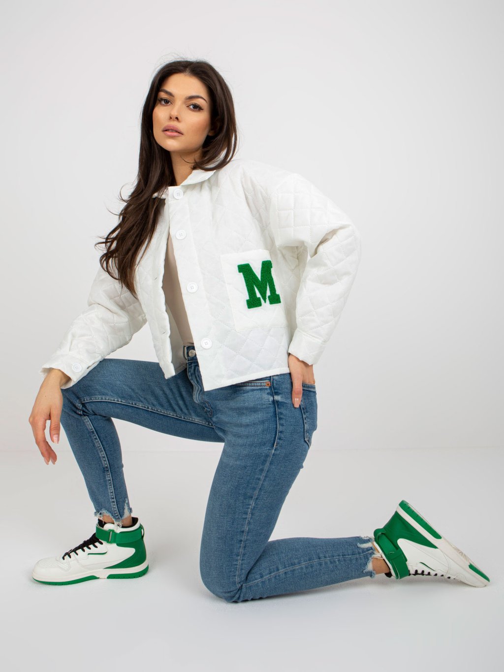 Krémes steppelt átmeneti kabát hímzéssel