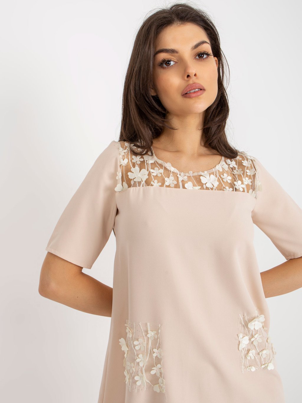 Krémszínű miniruha virágos rátéttel