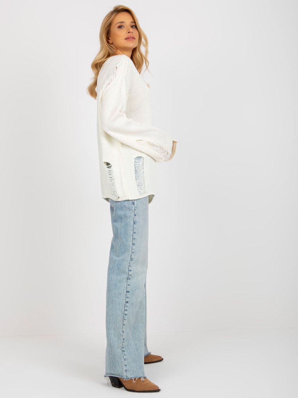 Krémszínű pulóver széles ujjakkal és lyukakkal