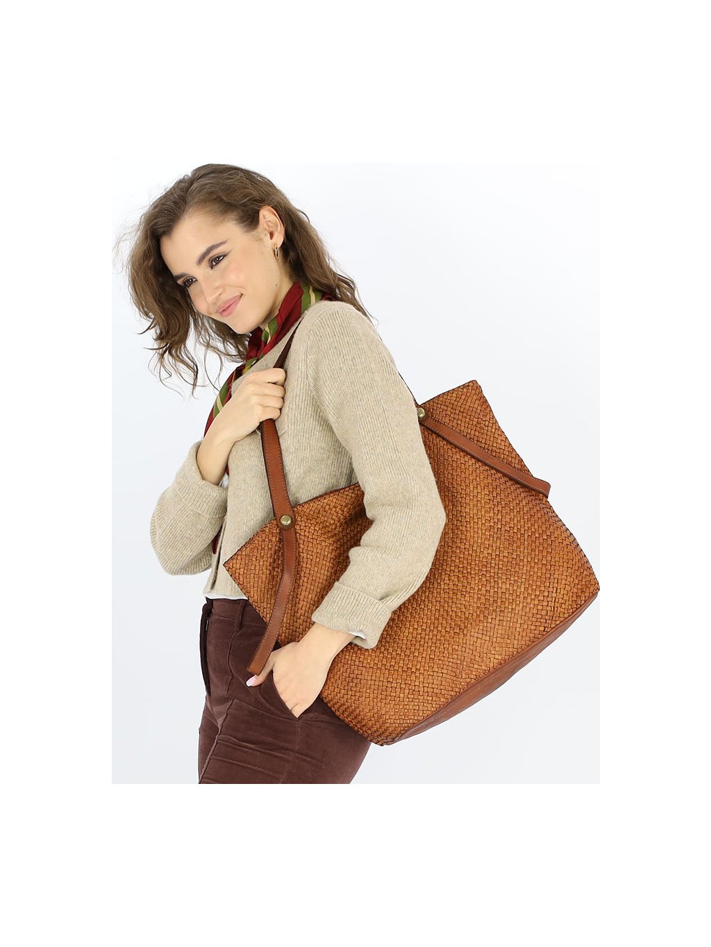 MARCO MAZZINI Camel színű nagy szőtt bőr shopper táska