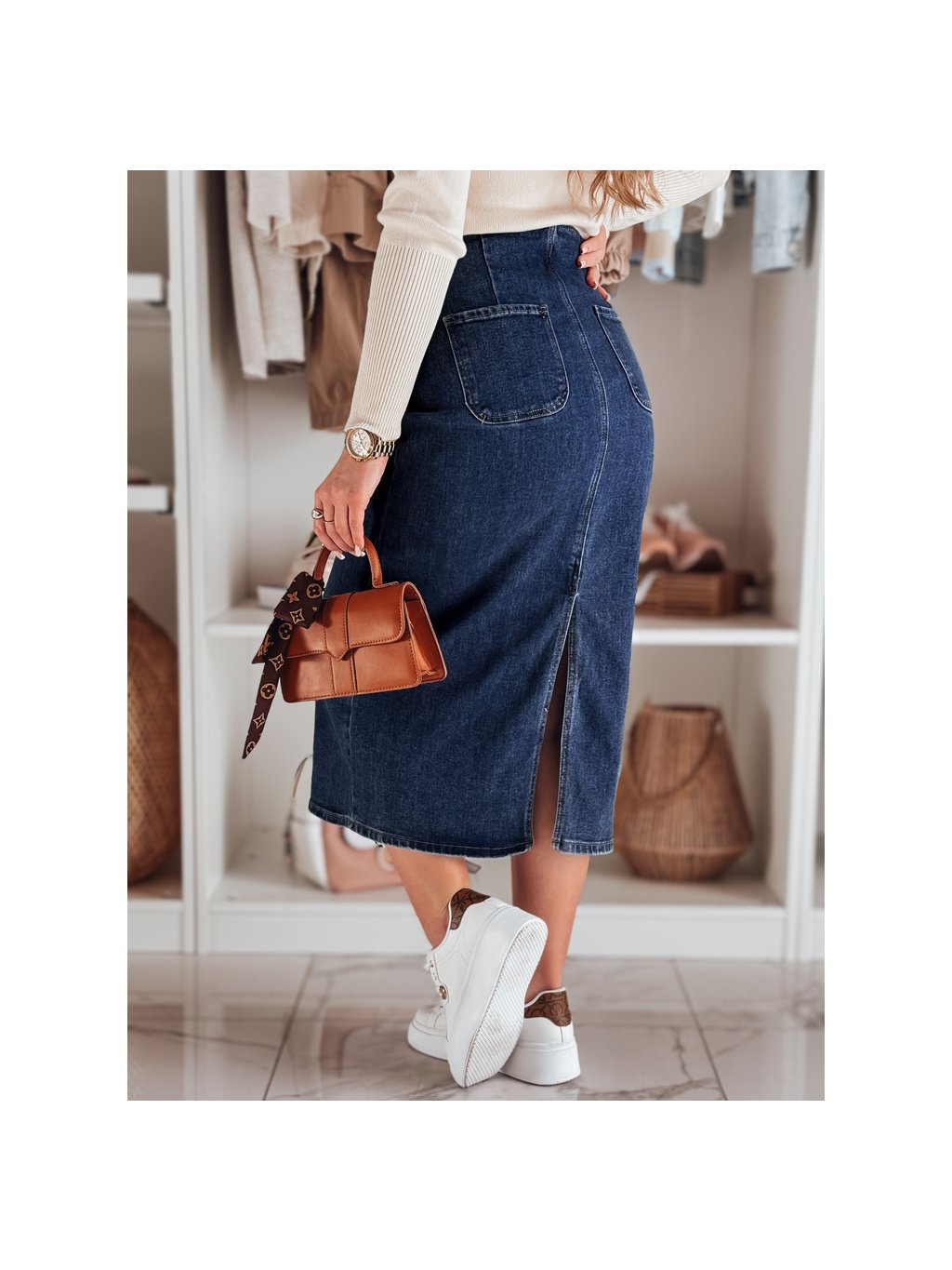 Női sötétkék farmer midi szoknya hasítékkal BLUEVIC