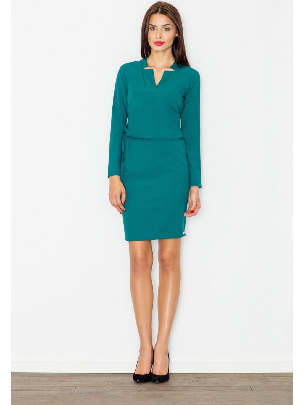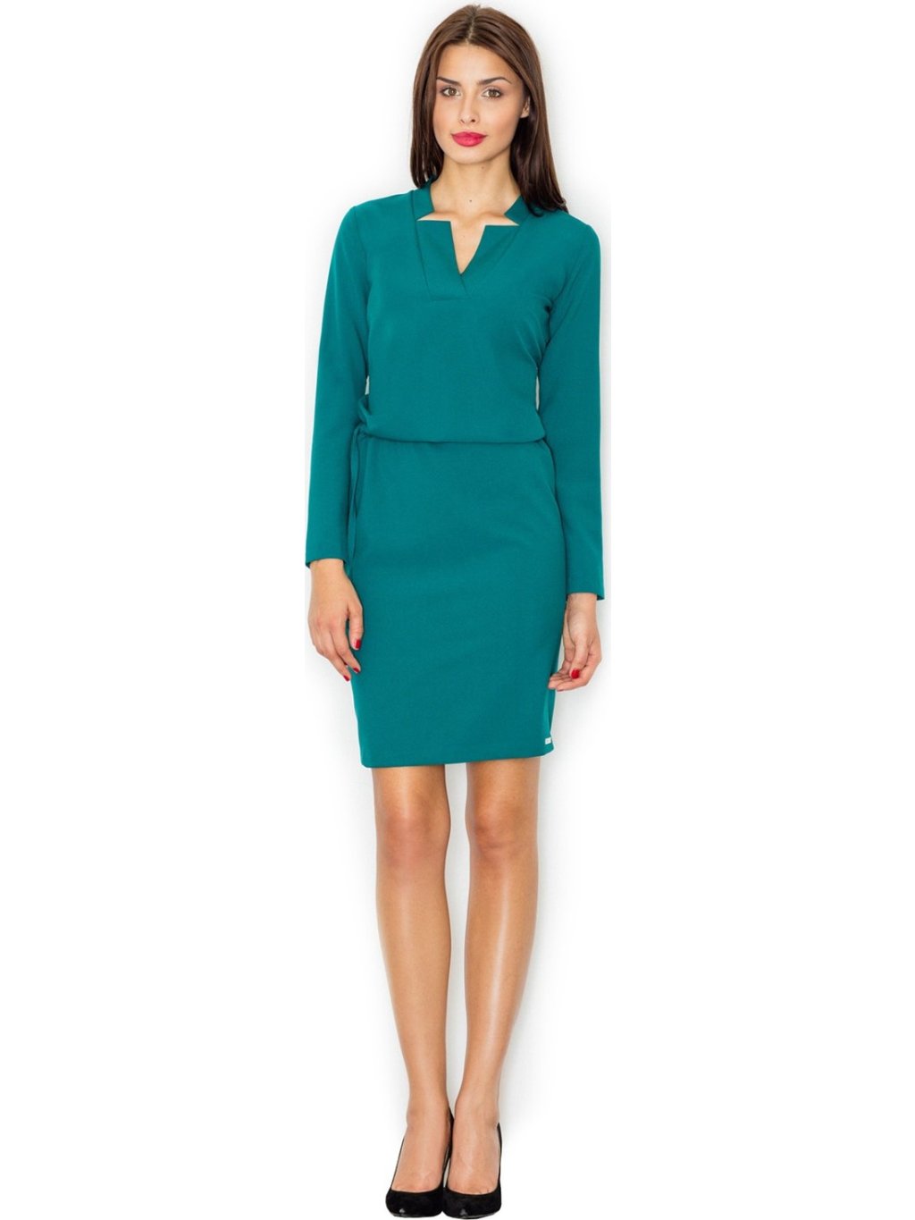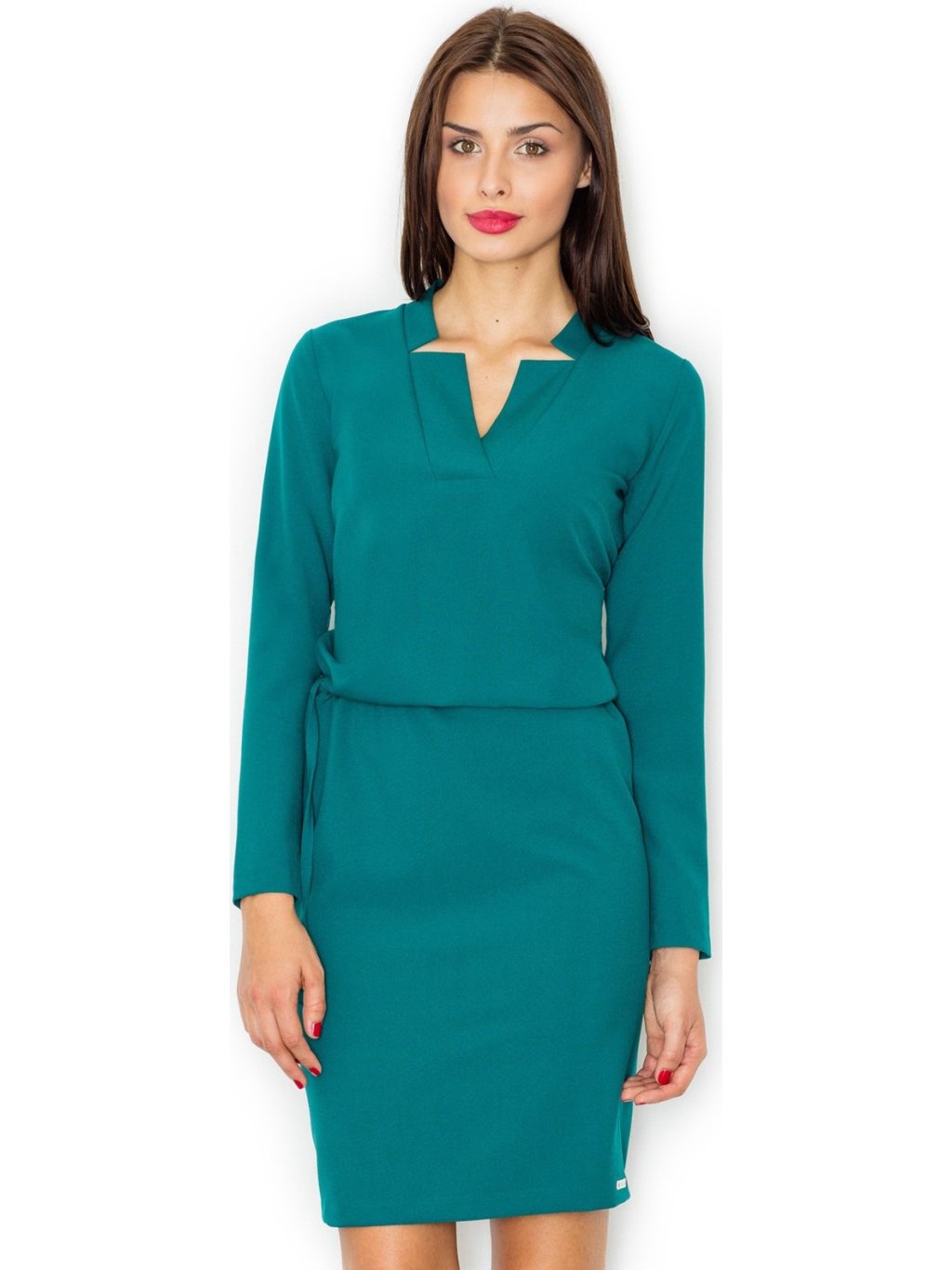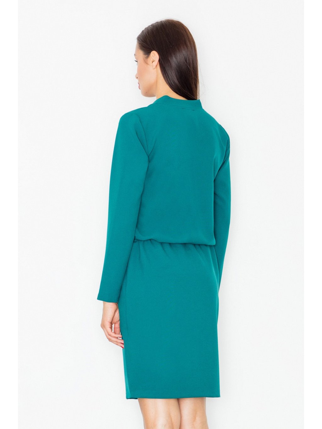 Női elegáns ruha hosszú ujjakkal és dekoratív nyakkivágással