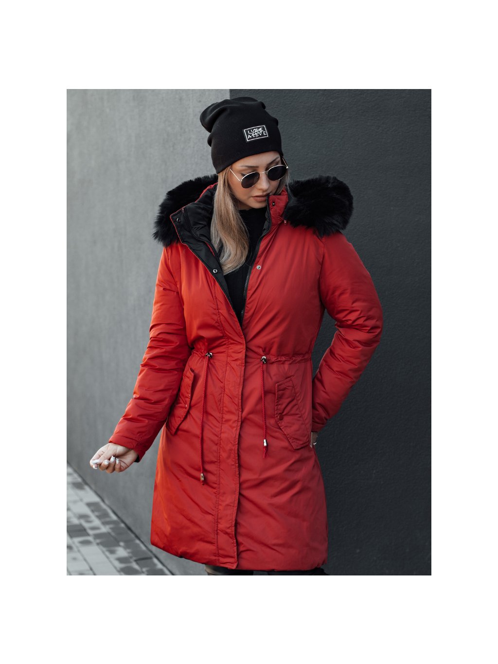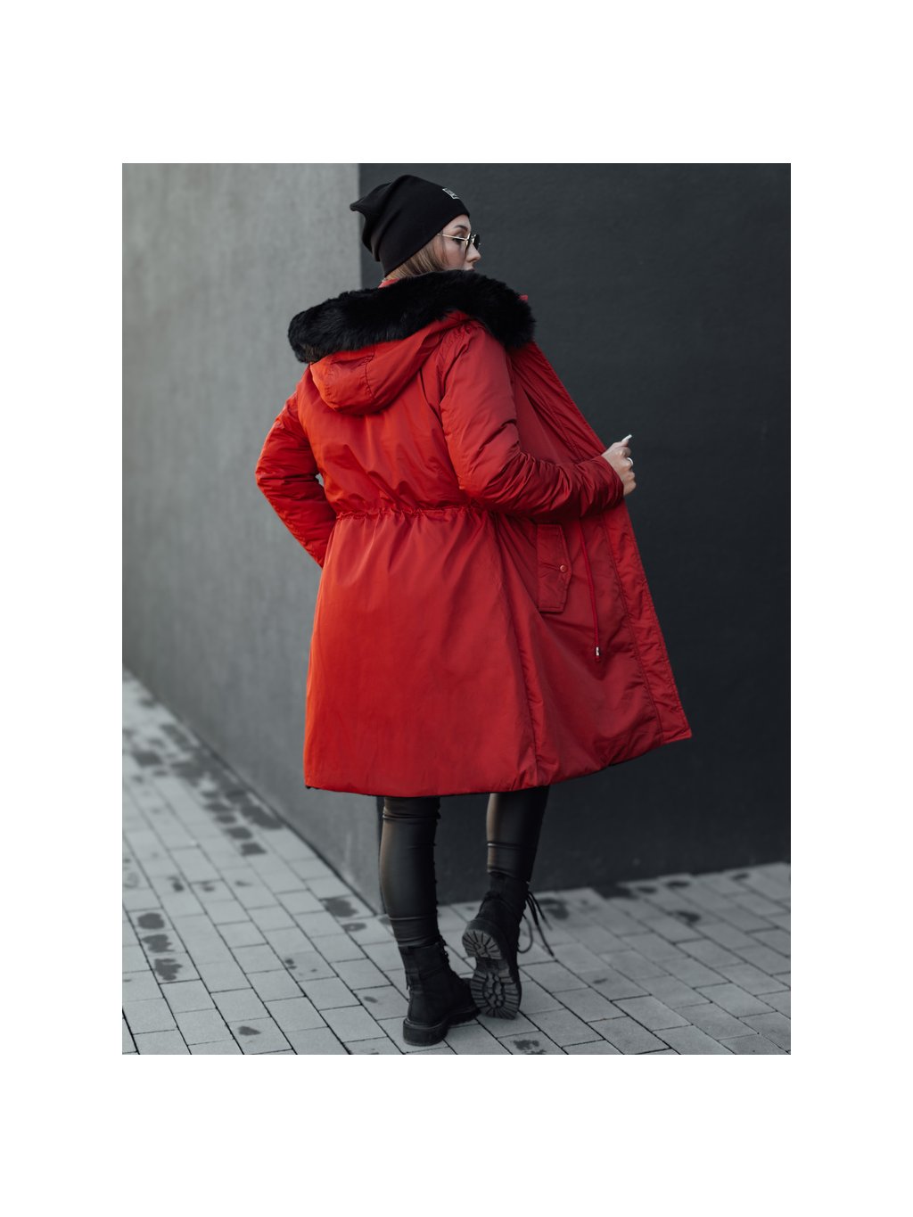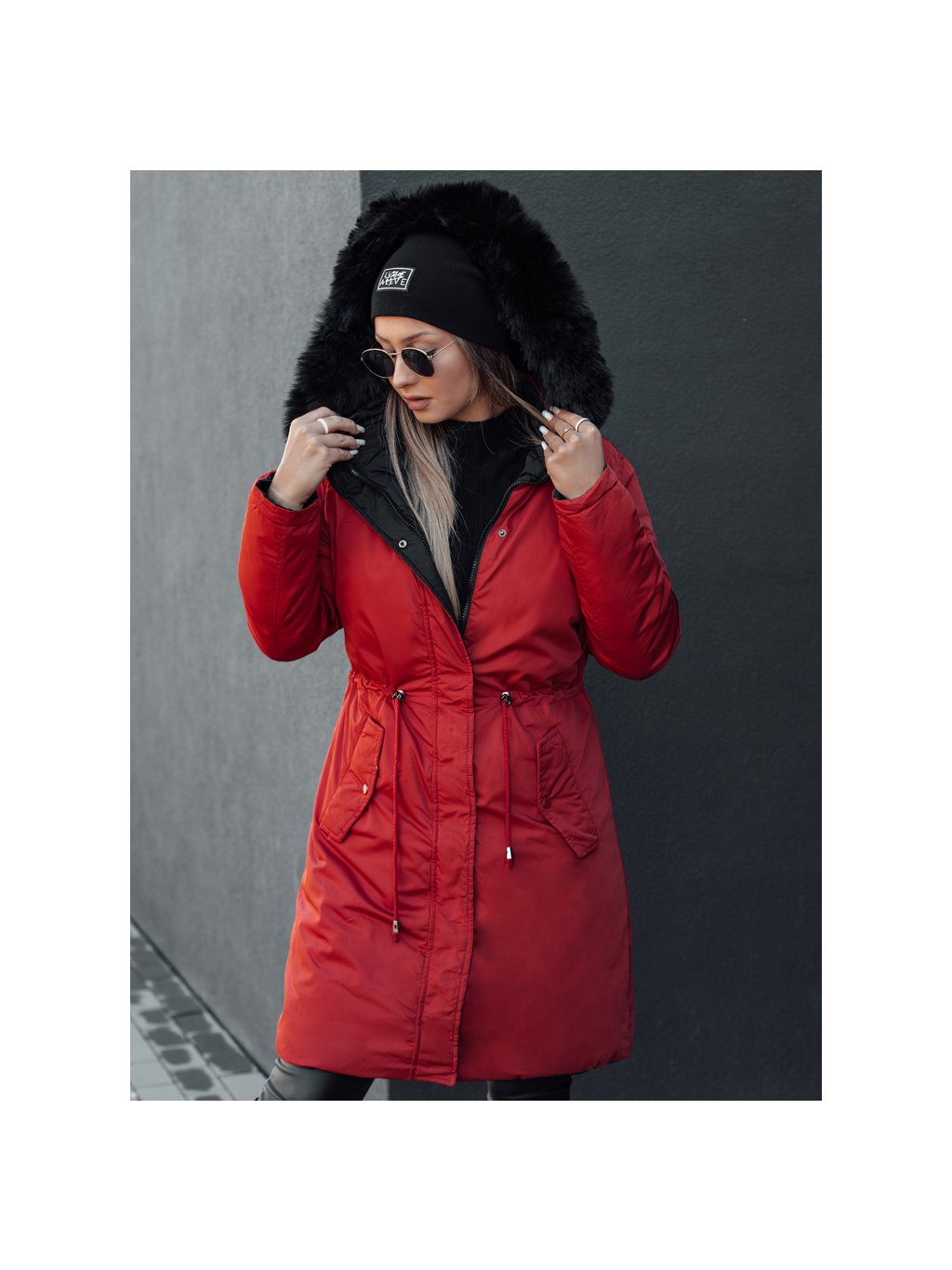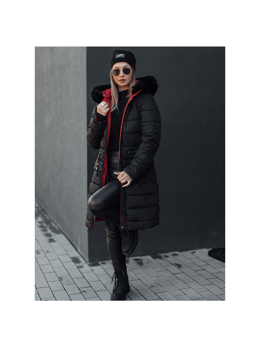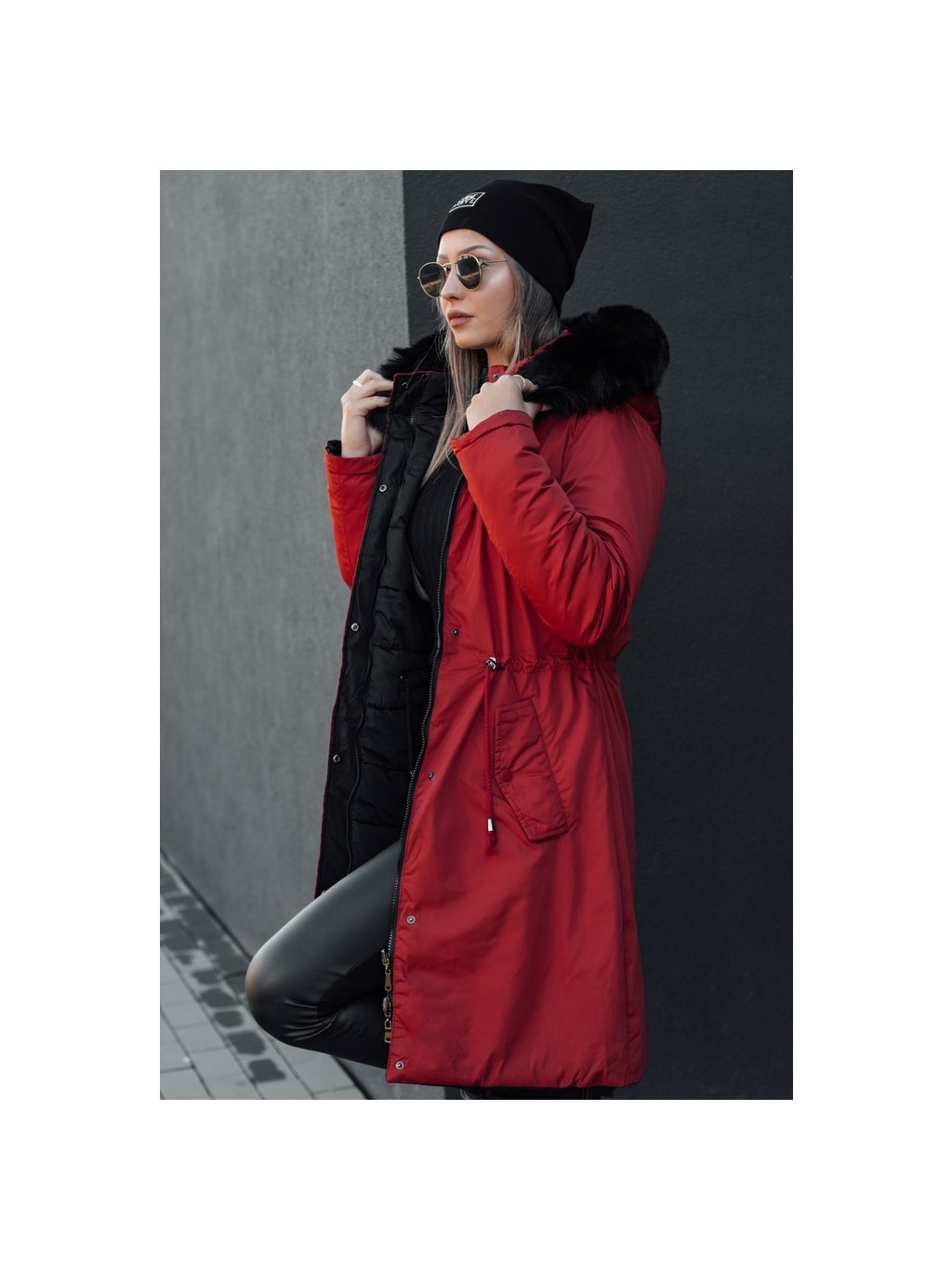 Piros-fekete női kifordítható téli kabát kapucnival TRENDNEL