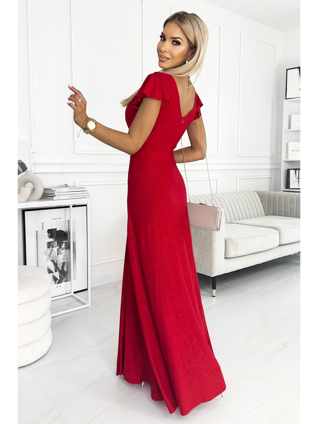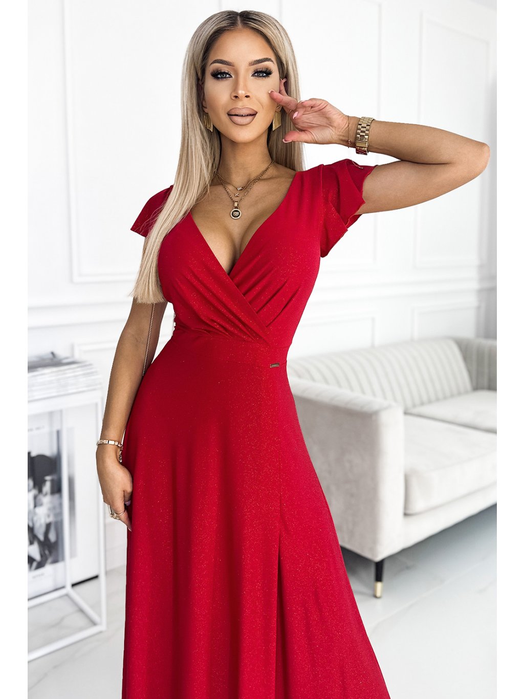 Piros hosszú ruha nyakkivágással és csillogással CRYSTAL