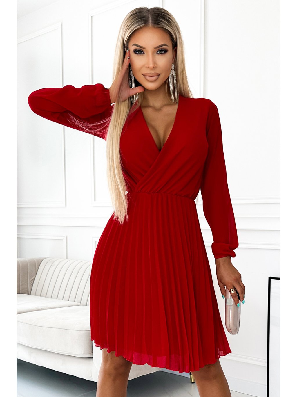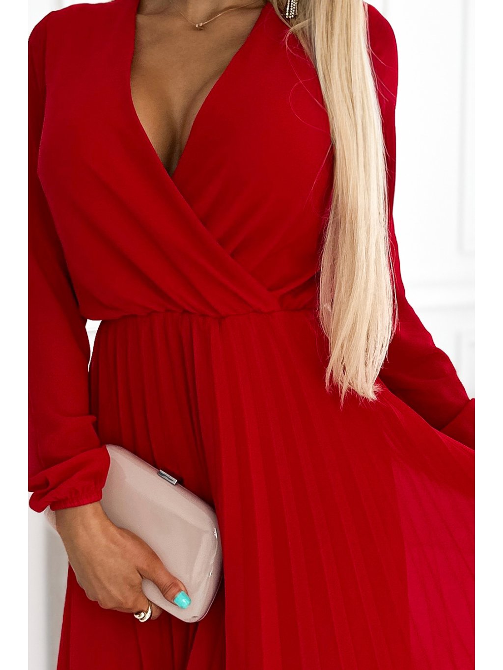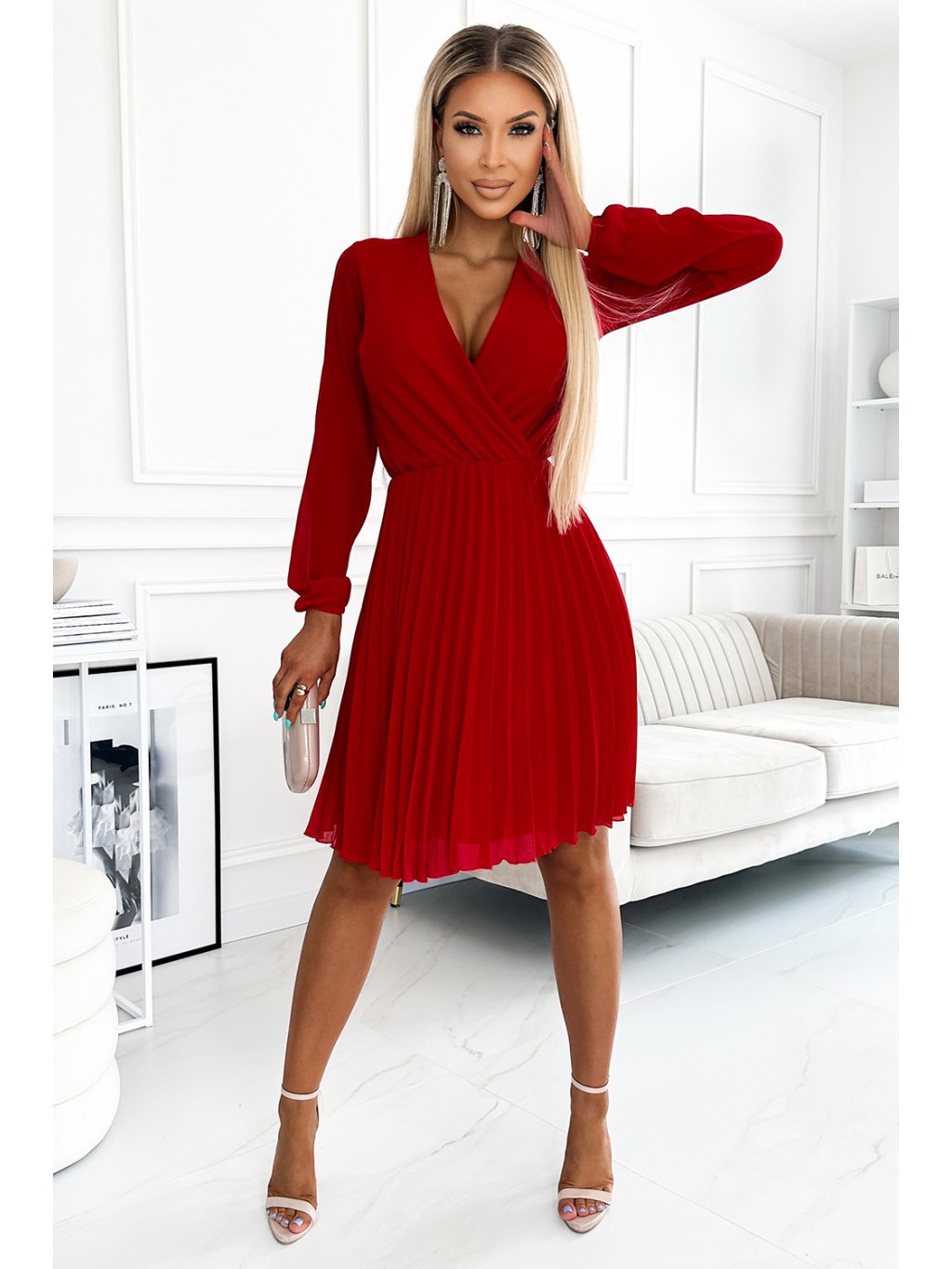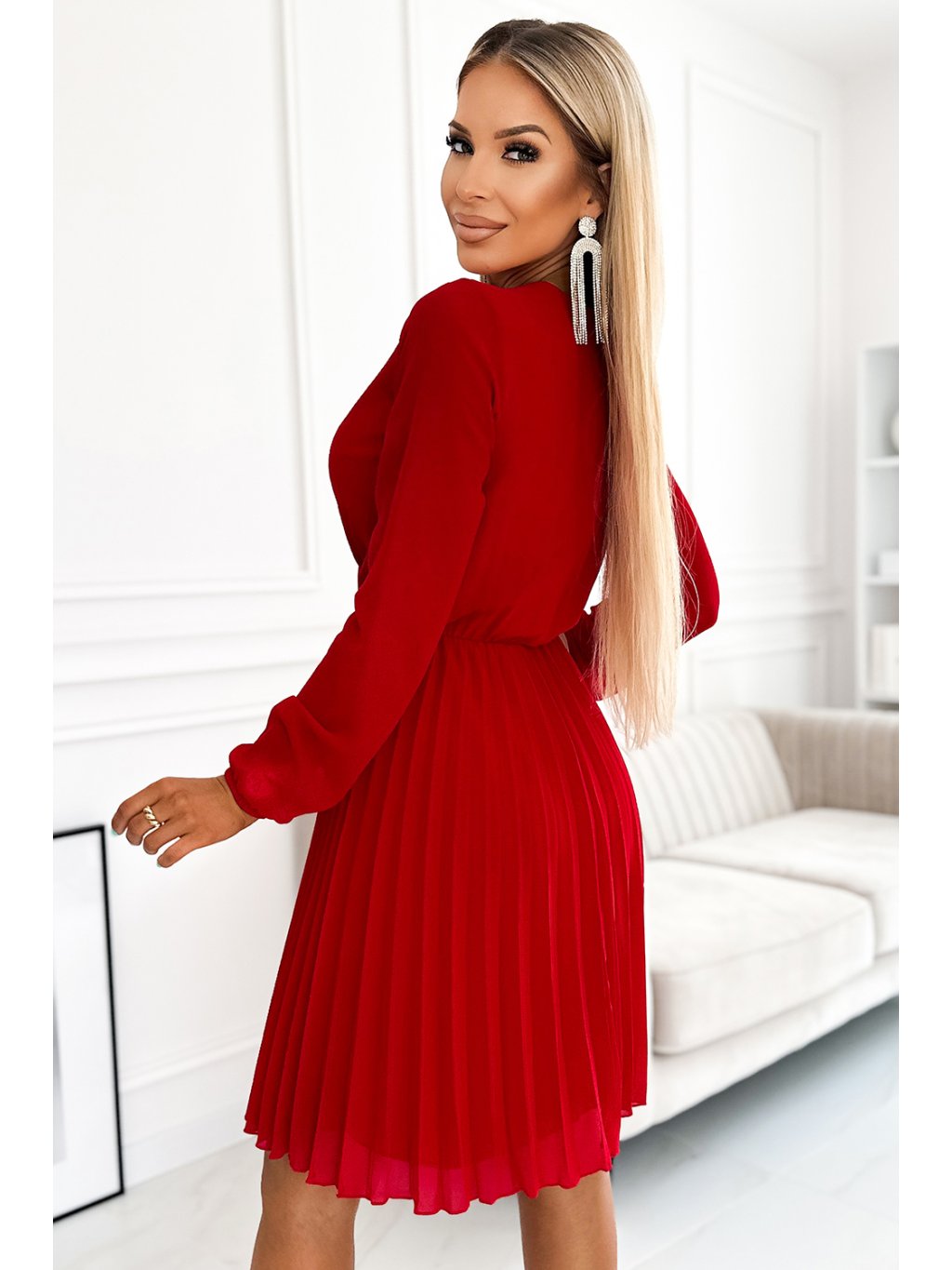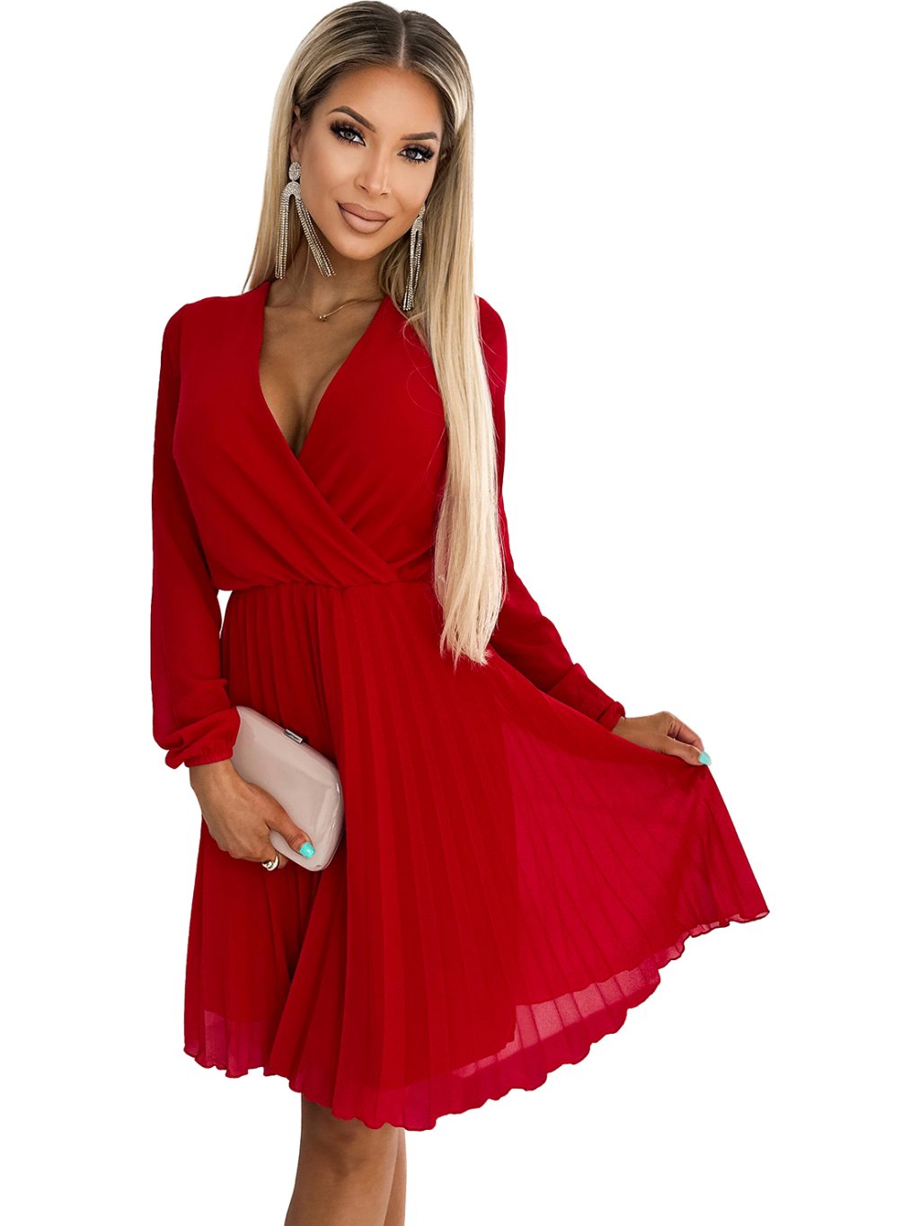 Világos rózsaszín női rakott ruha hosszú ujjal és nyakkivágással CAMILLA
