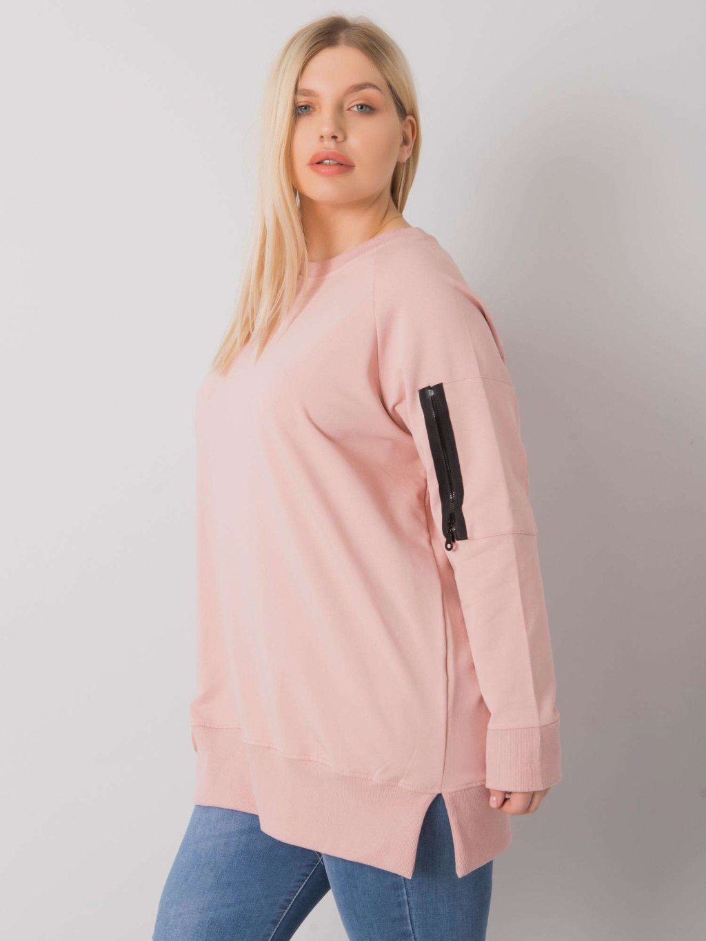 Púderszínű pulóver felirattal az ujjakon