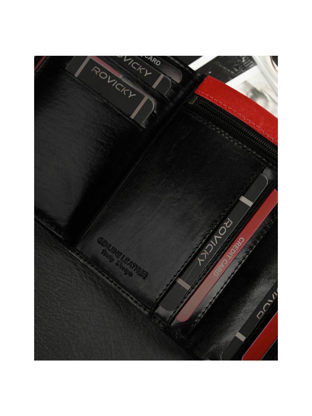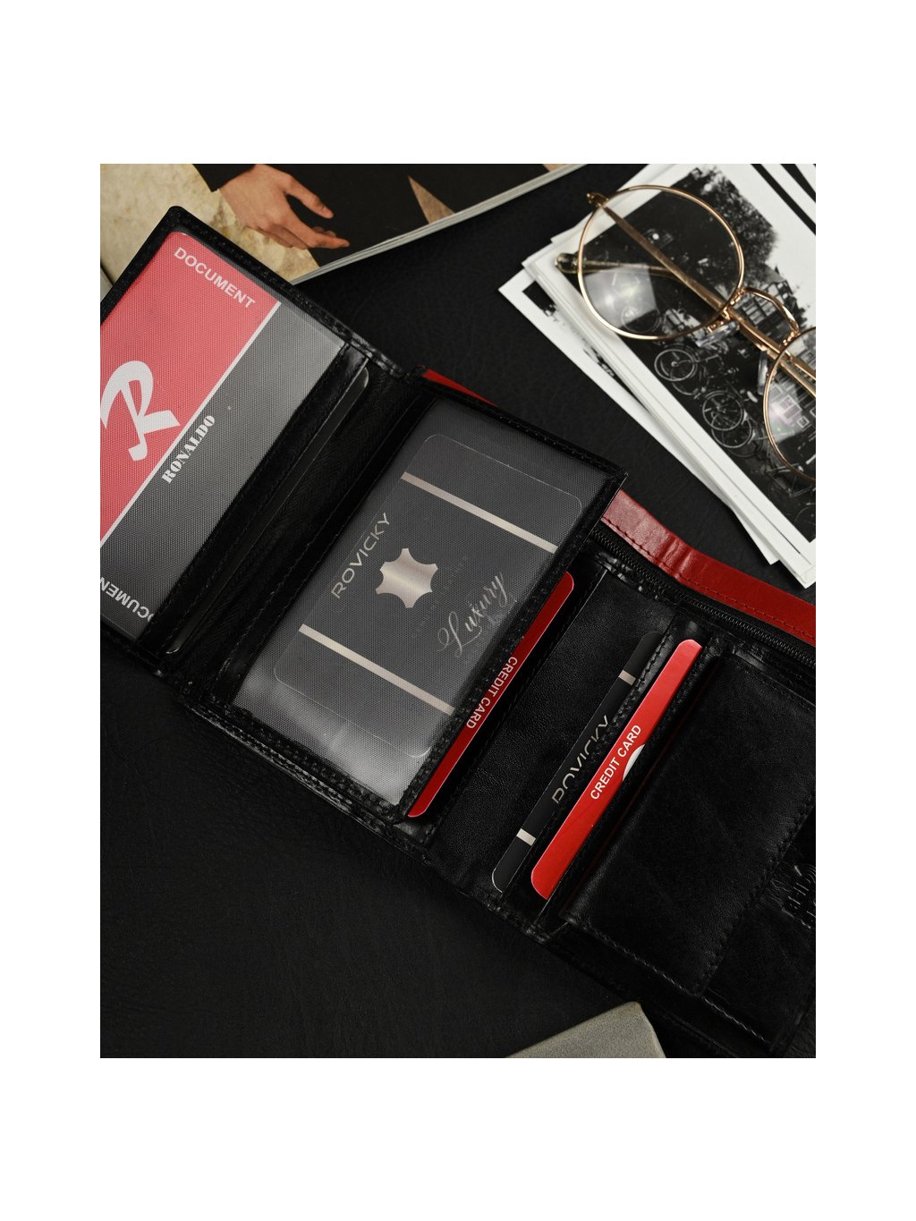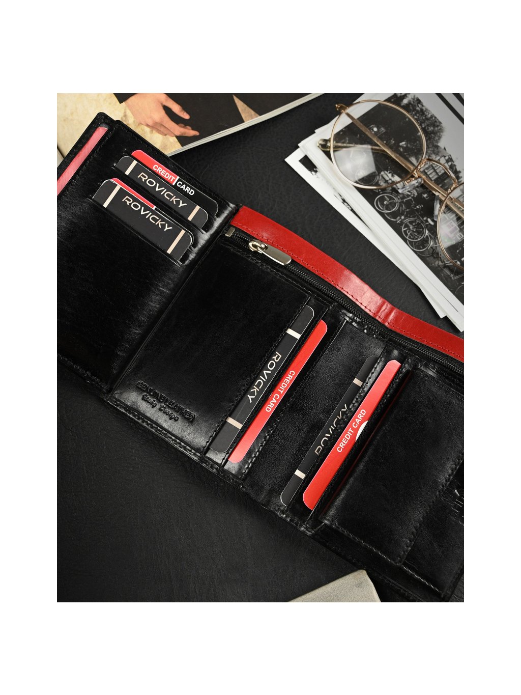 - belül 11 hely a kártyáknak, 4 hely a nagyobb dokumentumoknak, egy cipzáras zseb, egy pénzérme zseb a szabadalomnak, 2 rekesz a bankjegyeknek