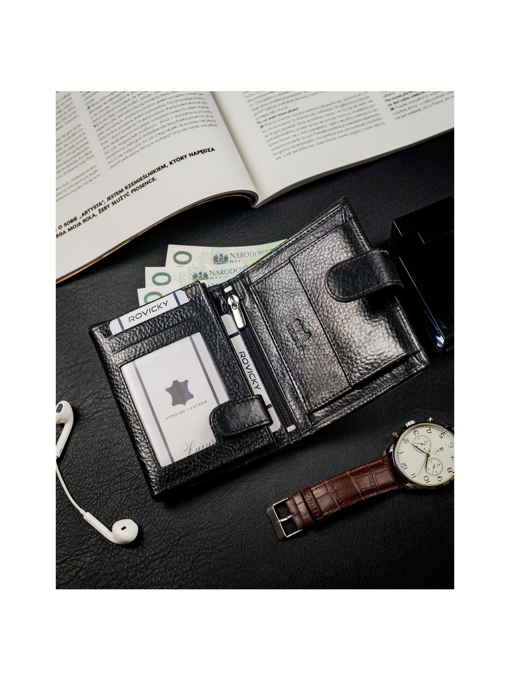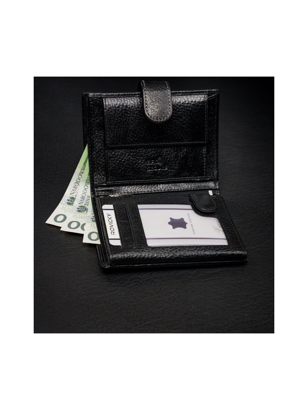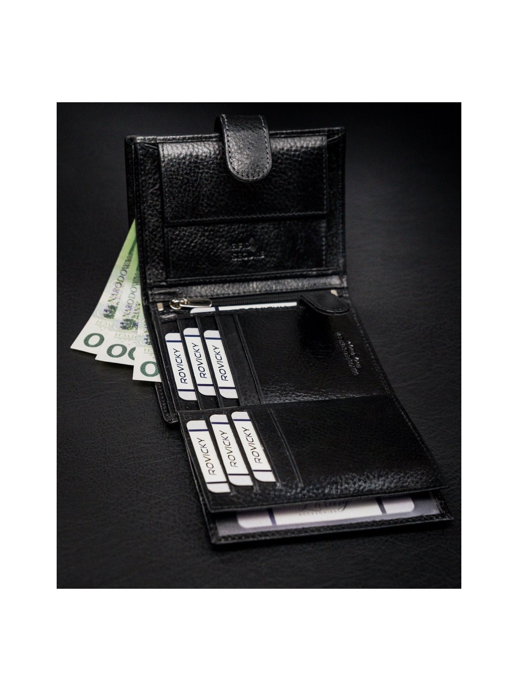 - belül van egy zseb az érméknek, 2 rekesz a bankjegyeknek, 10 hely a kártyáknak, 3 hely a nagyobb dokumentumoknak