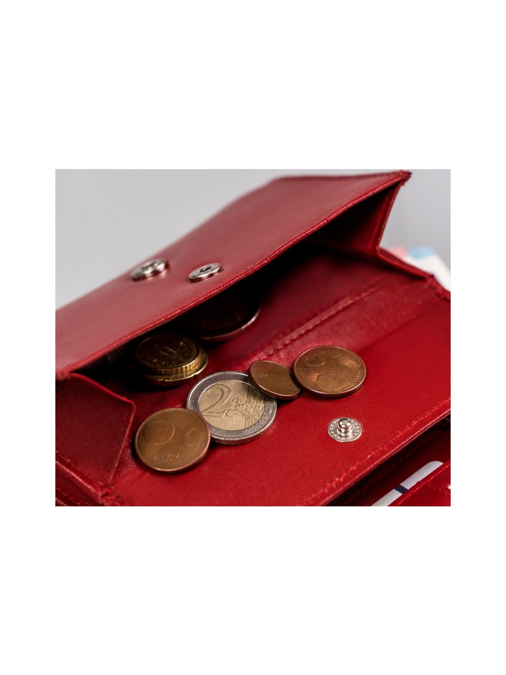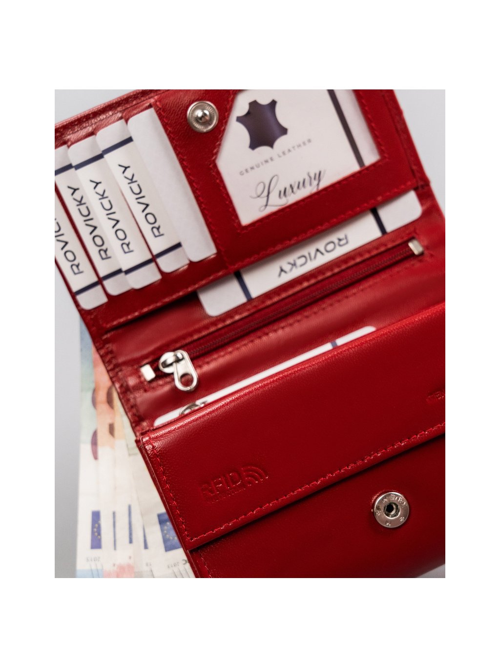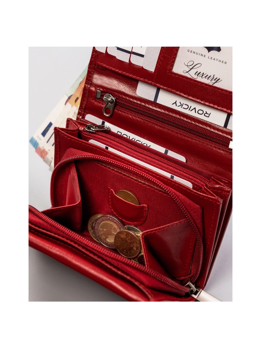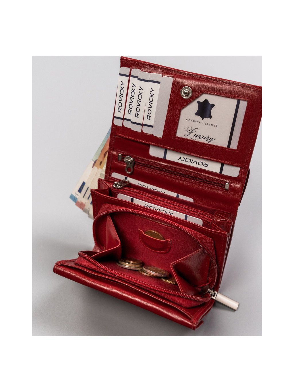 - belül 2 rekesz bankjegyek tárolására, 2 rekesz érméknek, 8 hely kártyáknak, 5 hely nagyobb dokumentumoknak, 2 cipzáras zseb