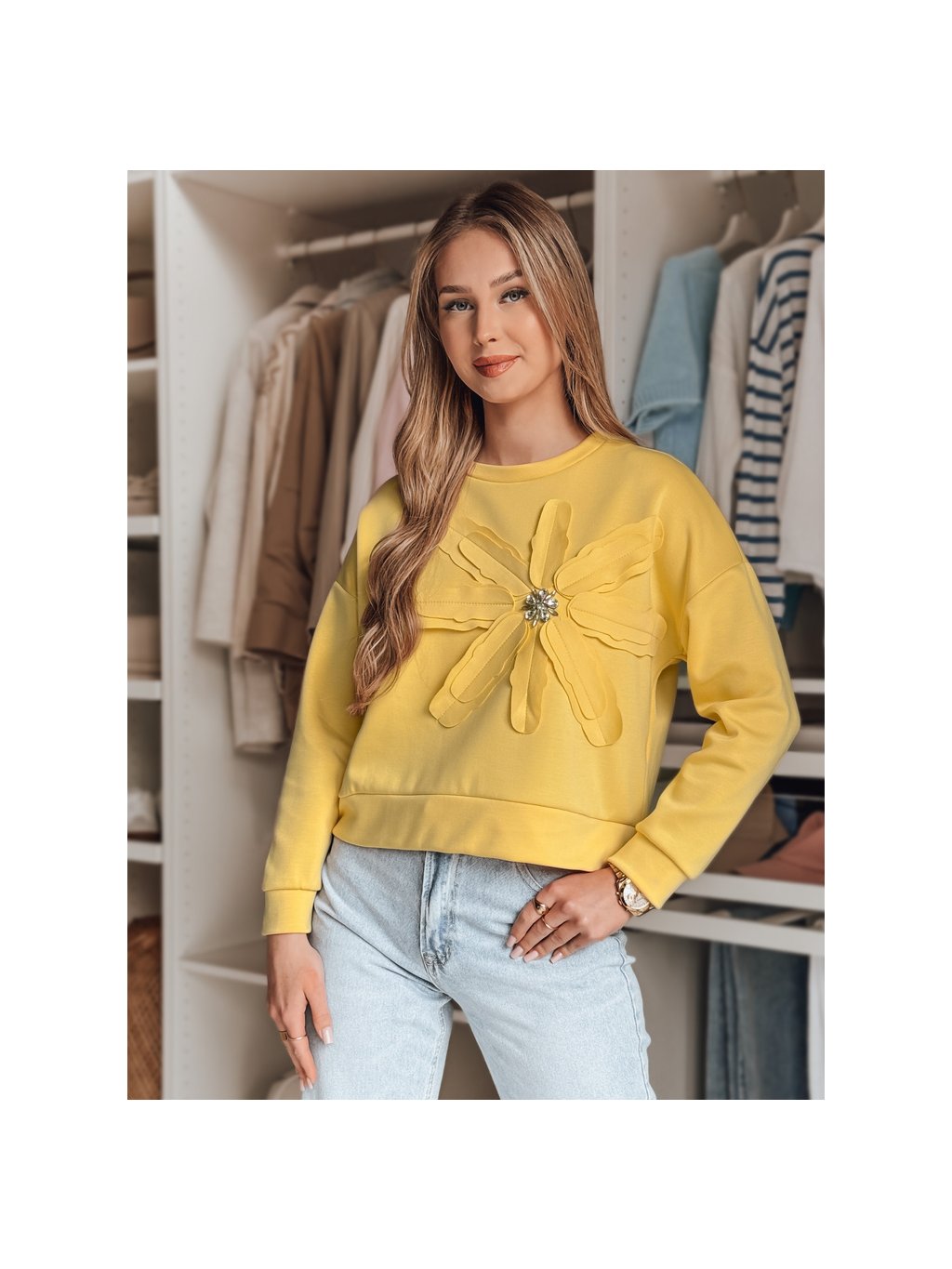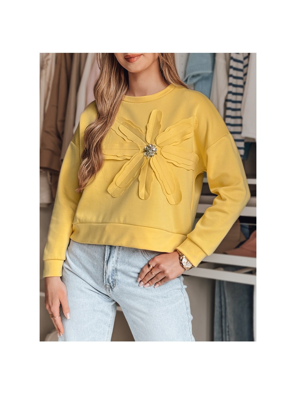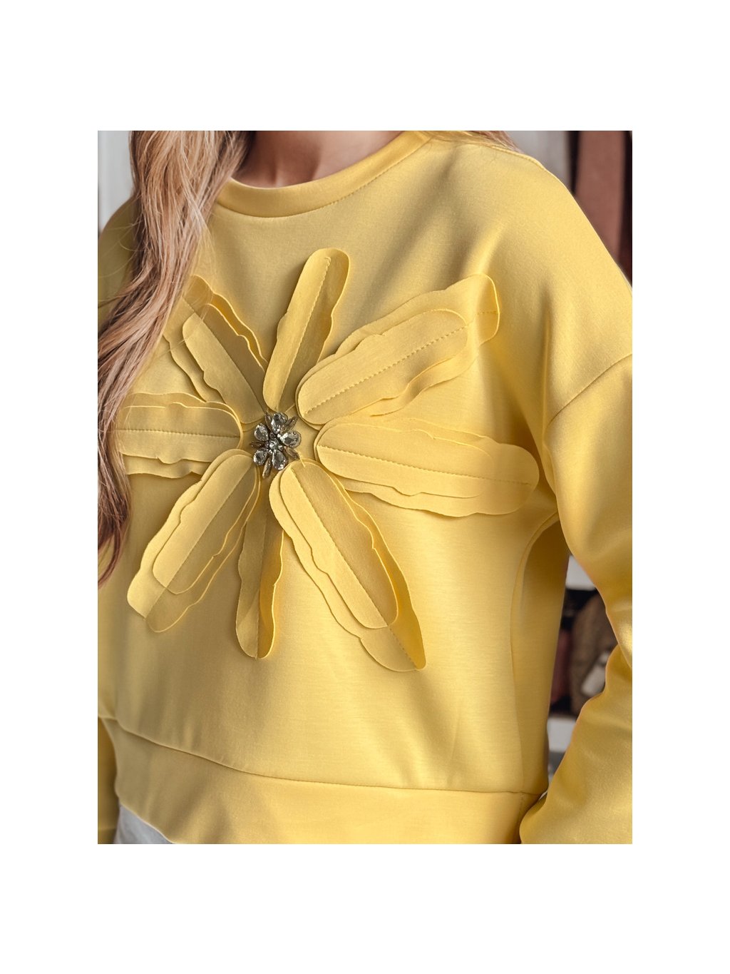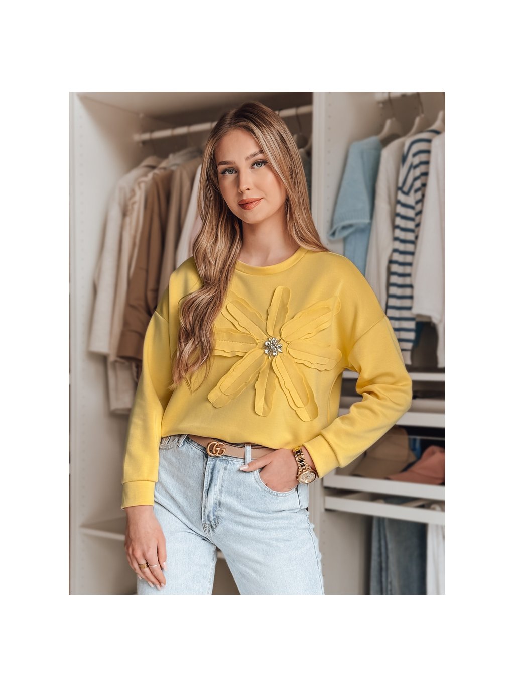 Sárga női pulóver virágos motívummal és brossal PETITKA
