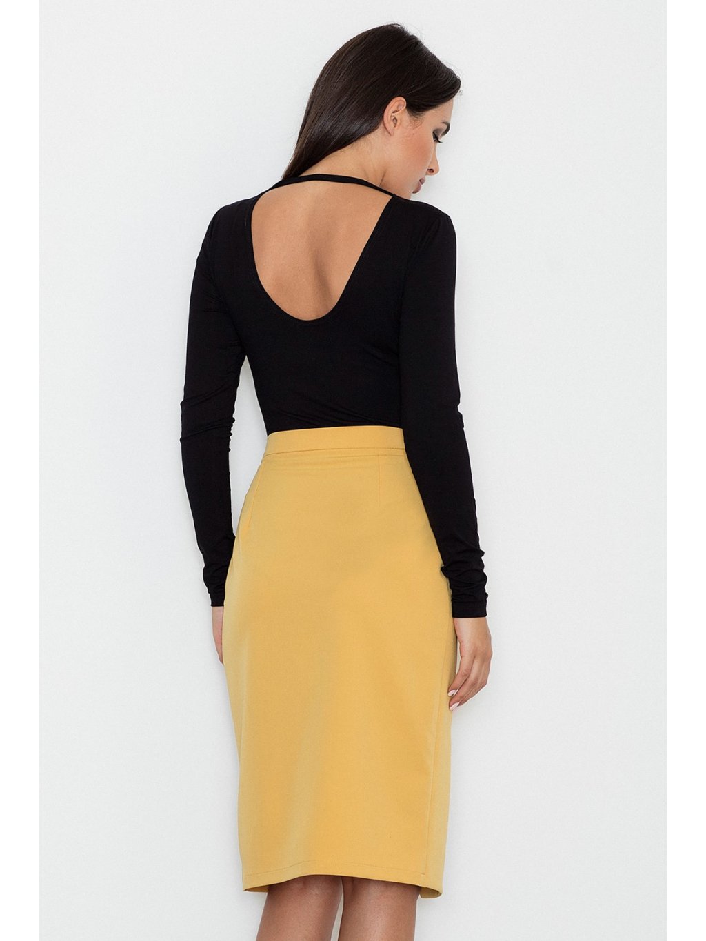 A szoknya hossza kissé térdalatti.